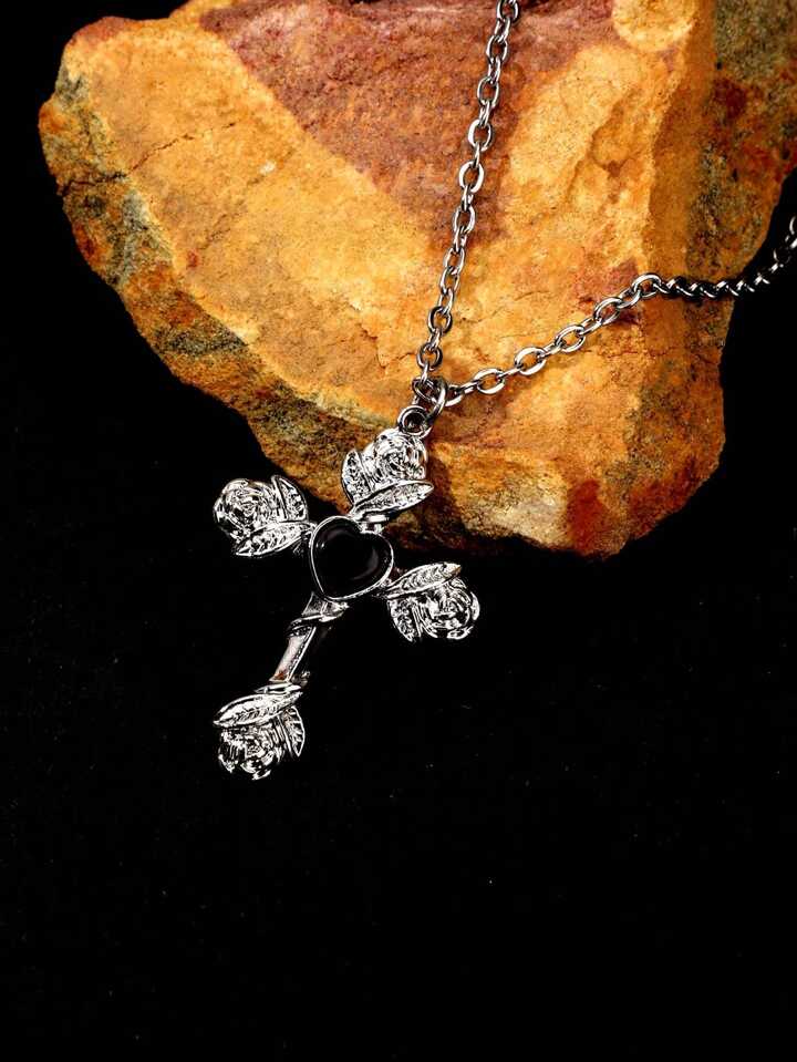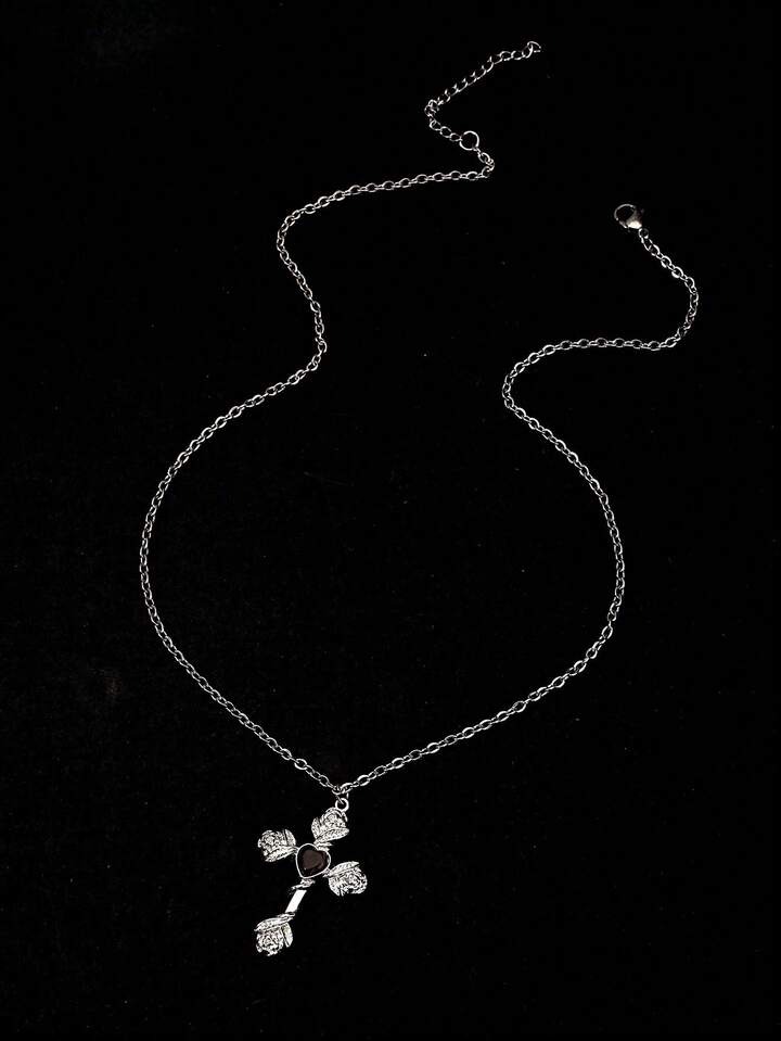 Goth Vintage Rose Flower, Cross & Heart Detail Pendant Necklace