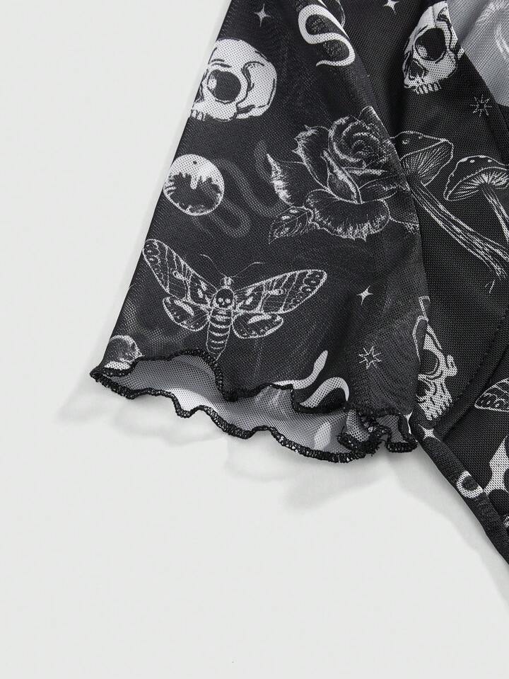 Goth Vintage Sweetheart Collar Short Sleeve Women Spider Print T-Shirt, Summer/ Summerouis /Summer Cothes