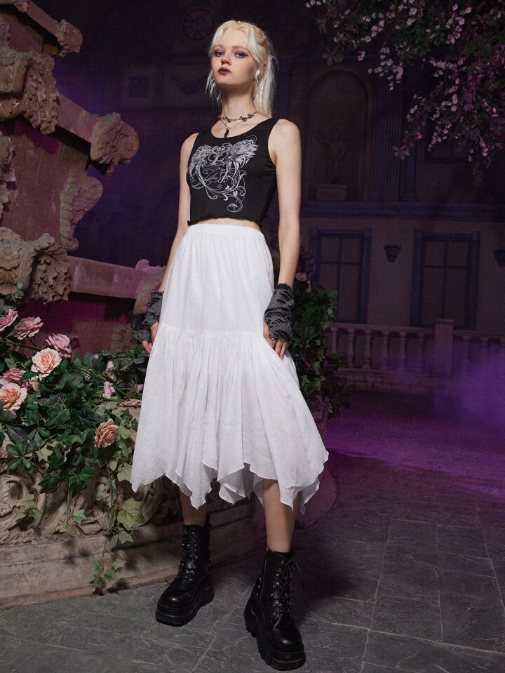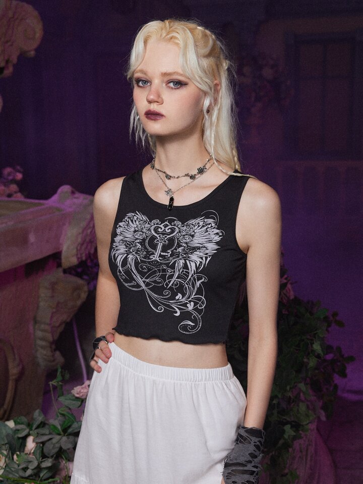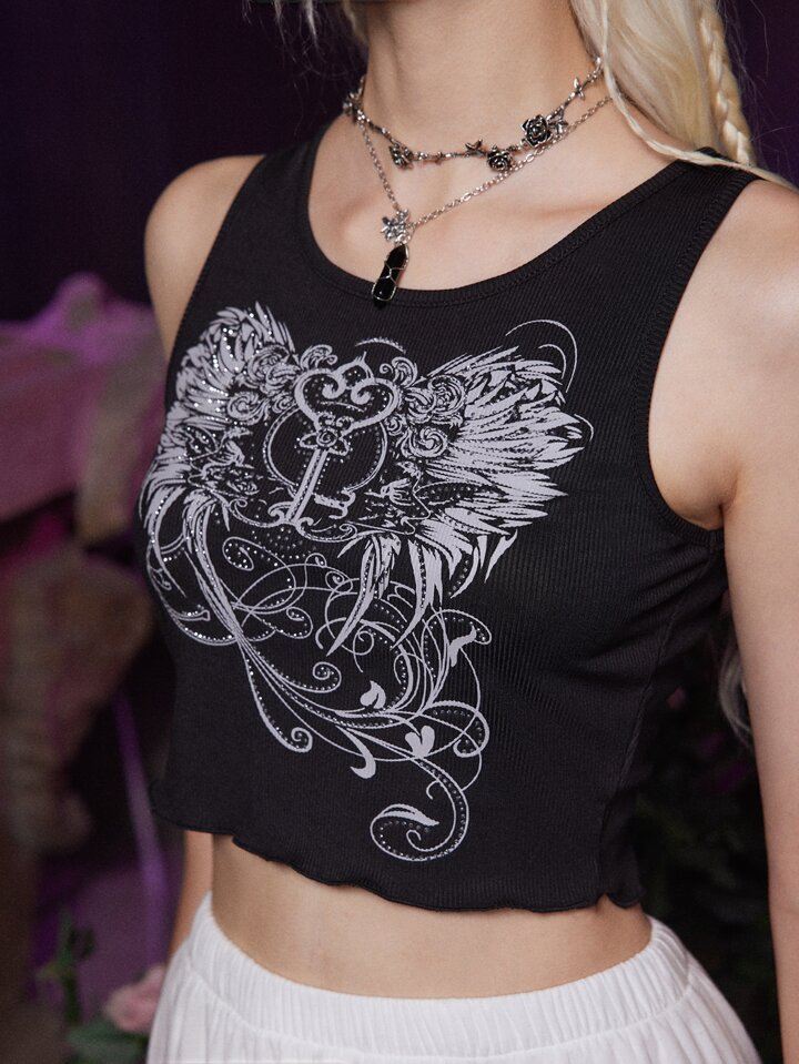 Goth Wings Graphic Rhinestone Lettuce Trim Ribbed Tank Top