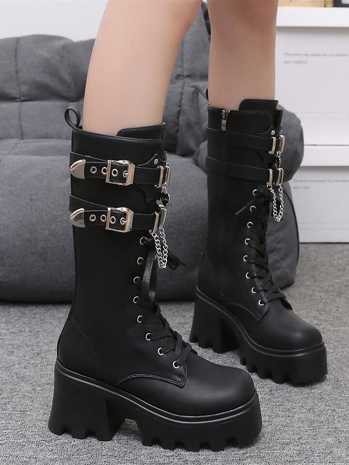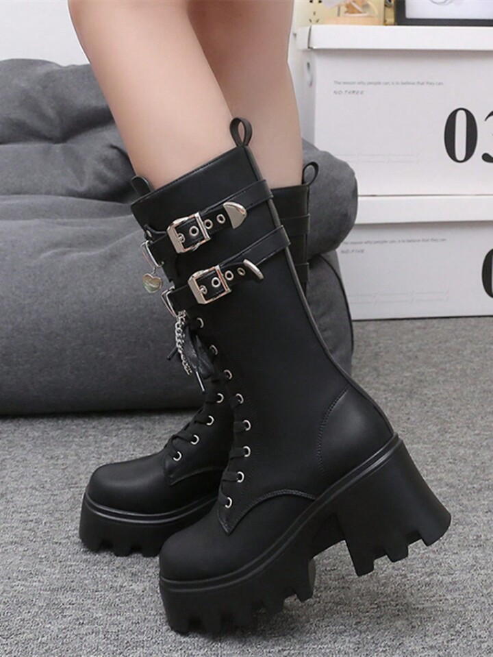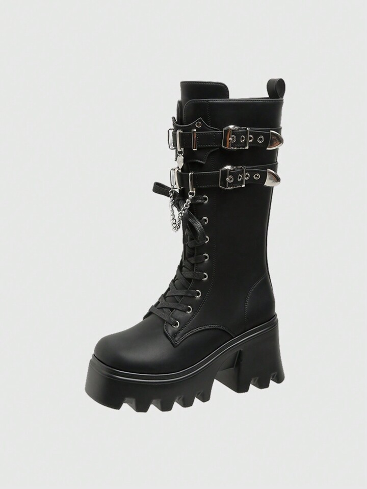Goth Women Buckle Decor Lace Up Mid-Calf Boots, Punk Outdoor Fashion Boots