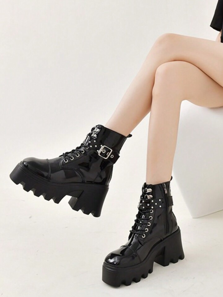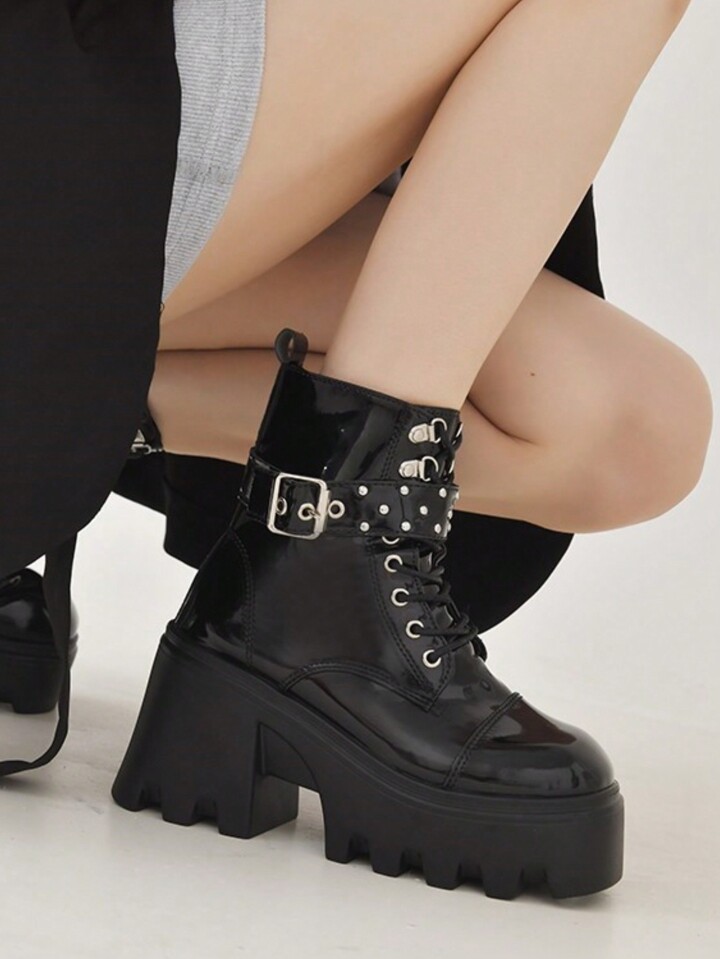 Goth Women Buckle Decor Lace-up Front Platform Chunky Heeled Combat Boots, Cool Outdoor Fashion Boots