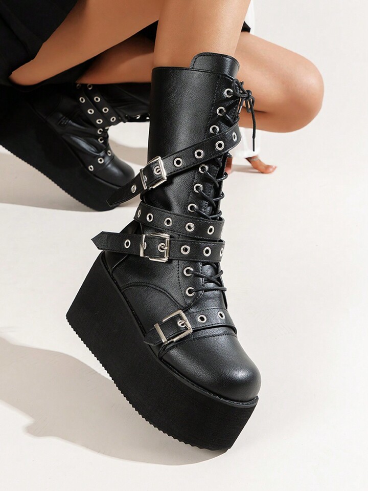 Goth Women Buckle Decor Lace-up Front Side Zip Wedge Boots, Punk Outdoor Fashion Boots
