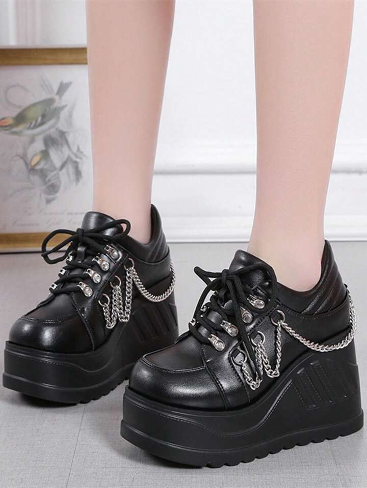 Goth Women Chain Decor Lace-Up Front Shoes, Punk Black Oxford Shoes Fall New Year Holiday Valentines Spring Shoes For Christmas