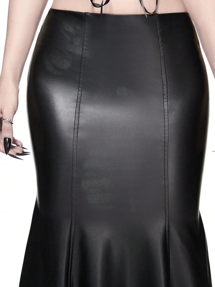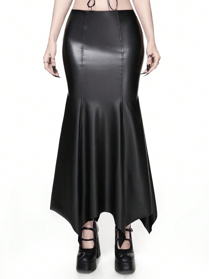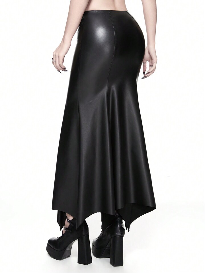 Goth Women Chain Decor Solid Color PU Leather Bat Shaped Hem Skirt