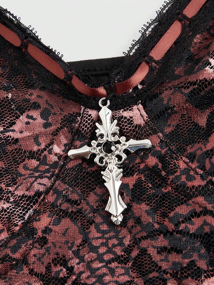 Goth Women Elegant Palace Style Cross Pendant Lace Mermaid Hem Cami Dress
