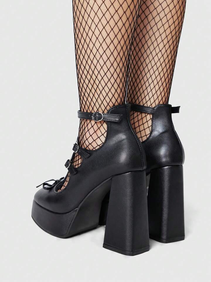 Goth Women Net Yarn Trim Patchwork Round Toe High Heel Punk PU Leather Black High Heels Pumps For Casual, Dark Campus
