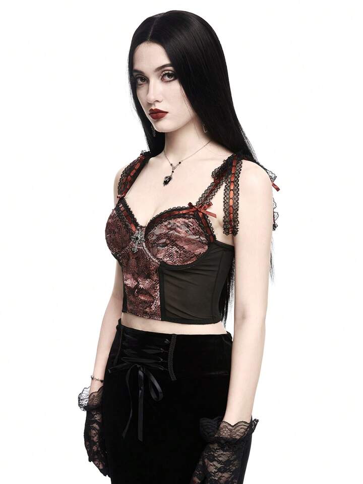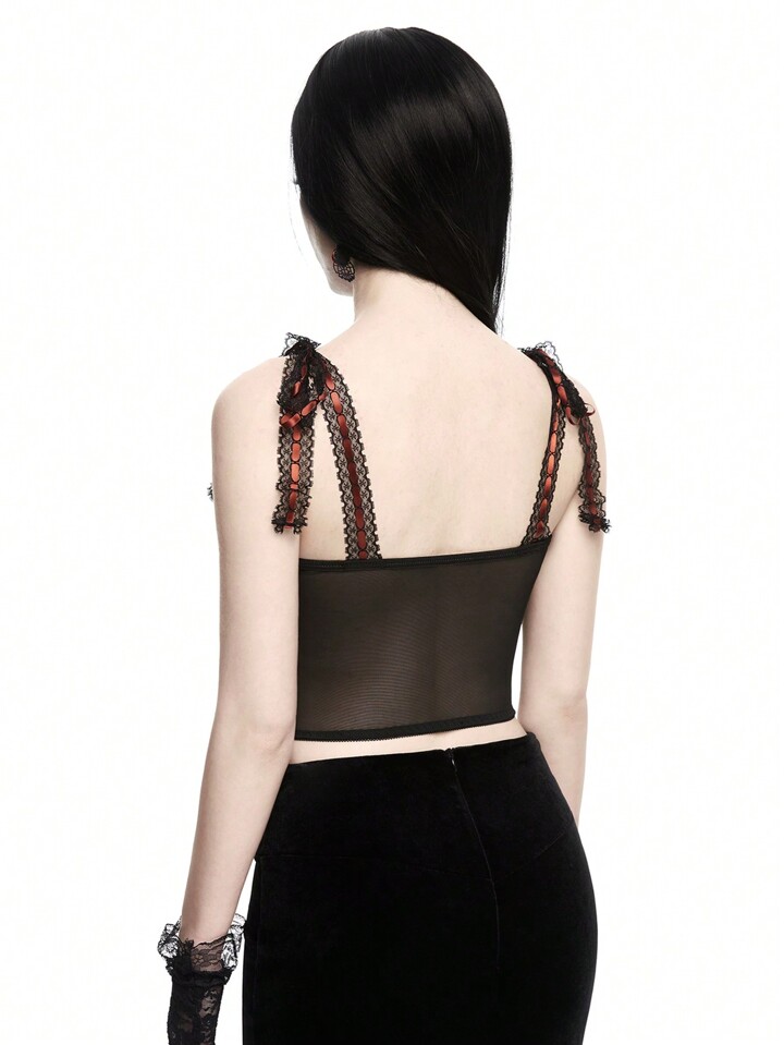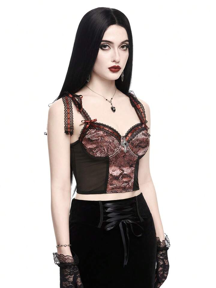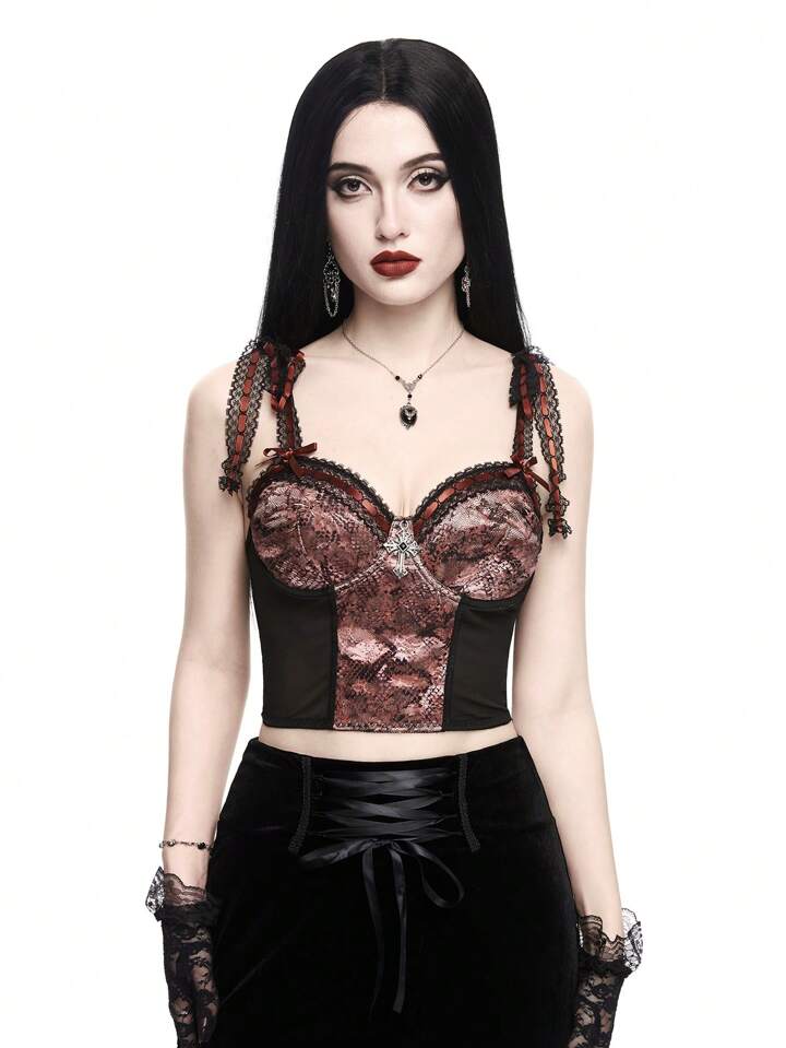 Goth Women Snake Print Mesh Cami Top With Cross Pendant, Ribbon And Lace-Up Design