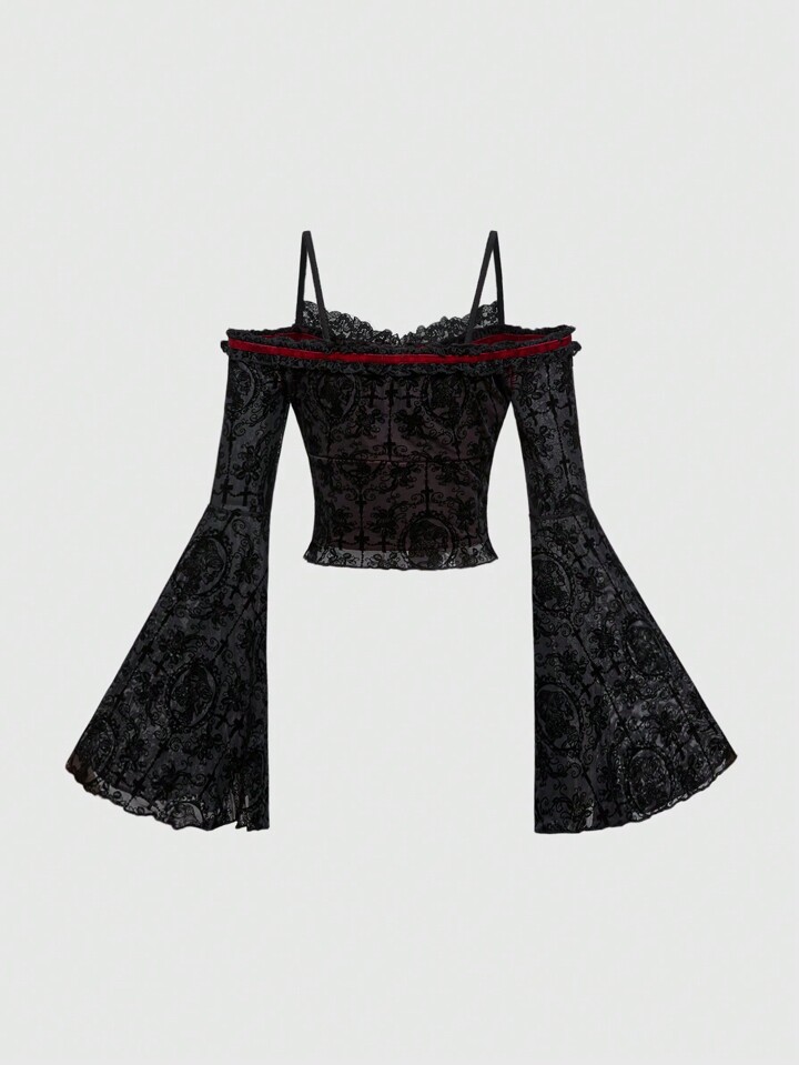 Goth Women Vintage Grunge 2 In 1 Cold Shoulder Flare Sleeve Cross & Bow Decor Flocked Fabric Top