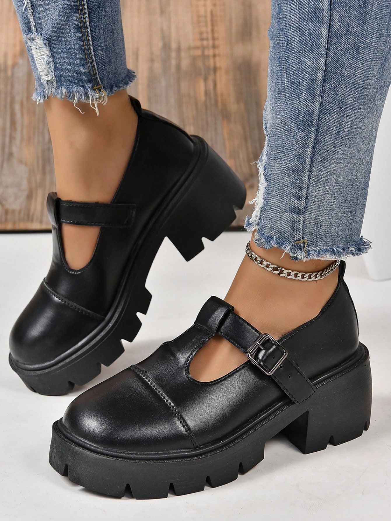Goth Women's 2023 New Round Toe Black College Style T-Strap Wedge & Thick Sole Shoes