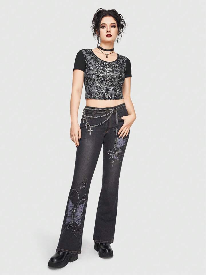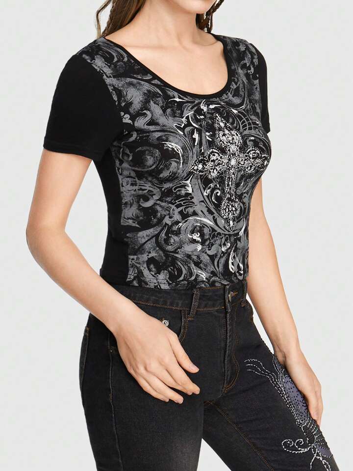 Goth Women's Black Cross & Baroque Print Crew Neck T-Shirt