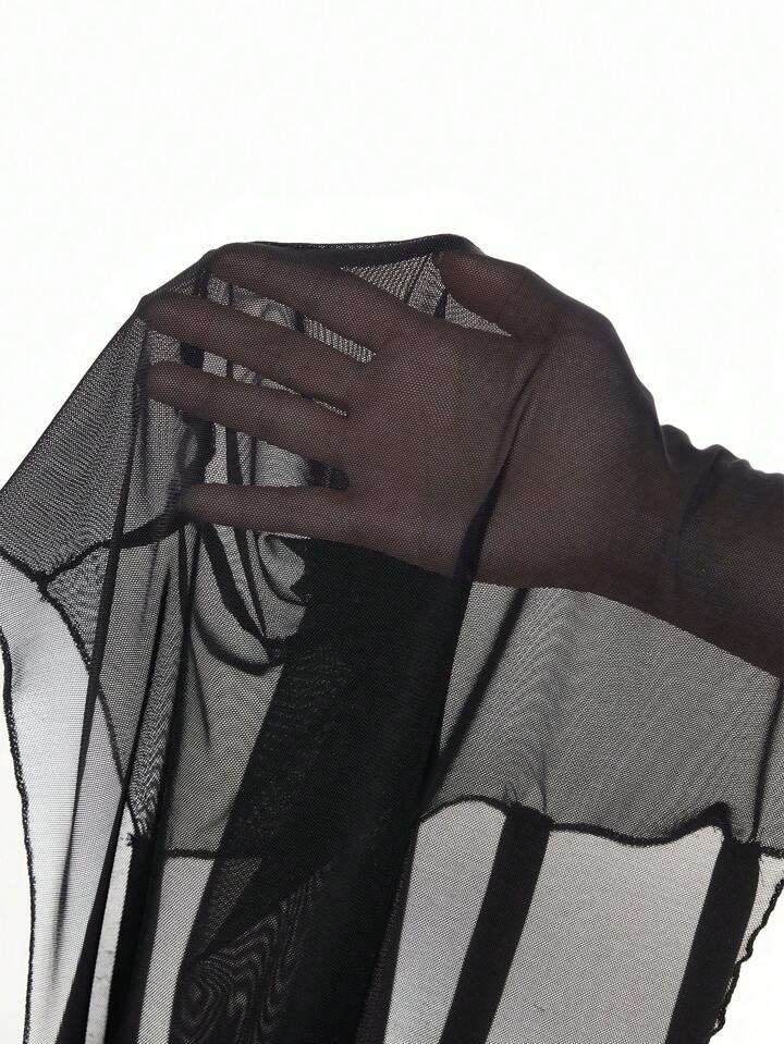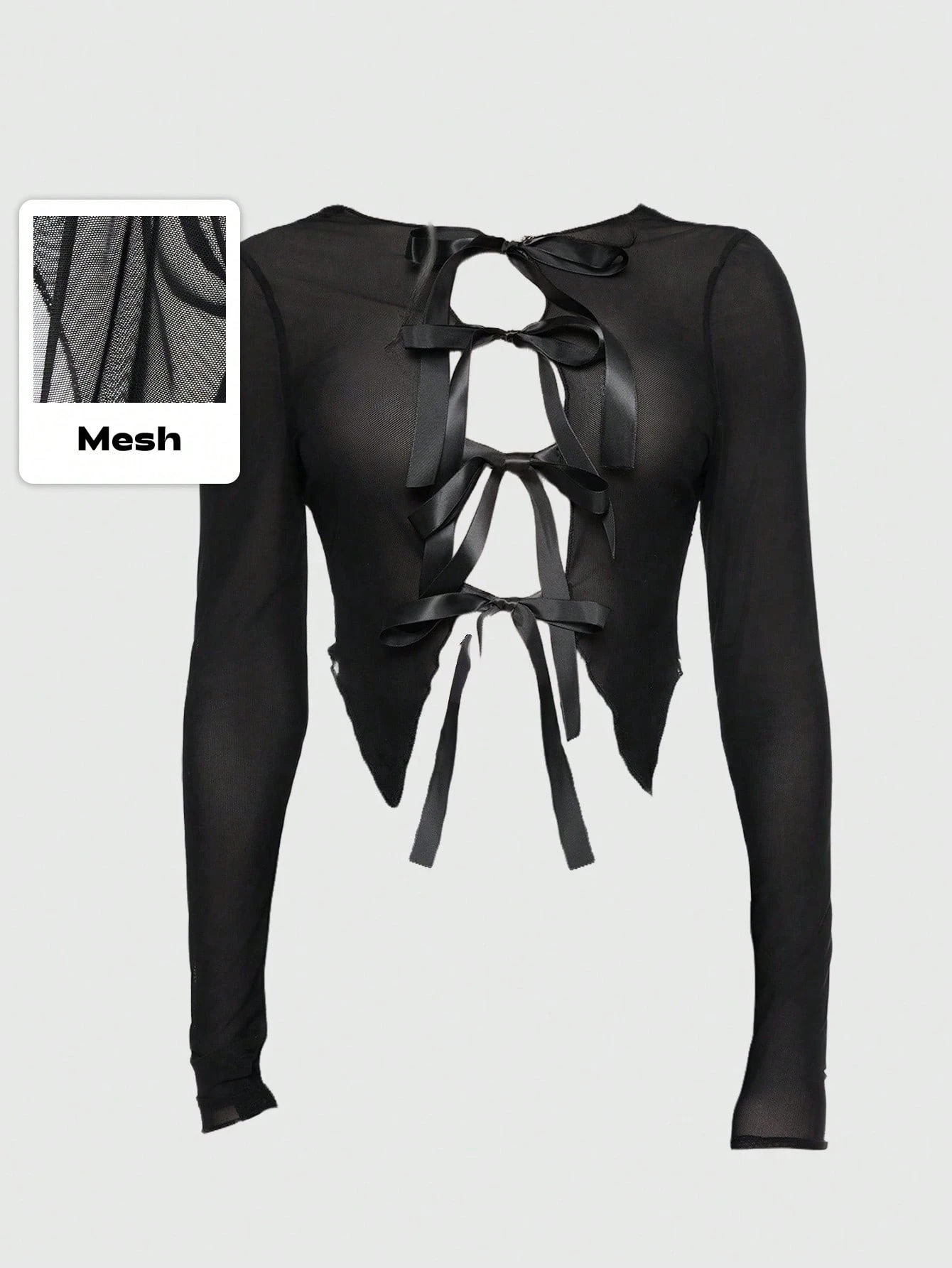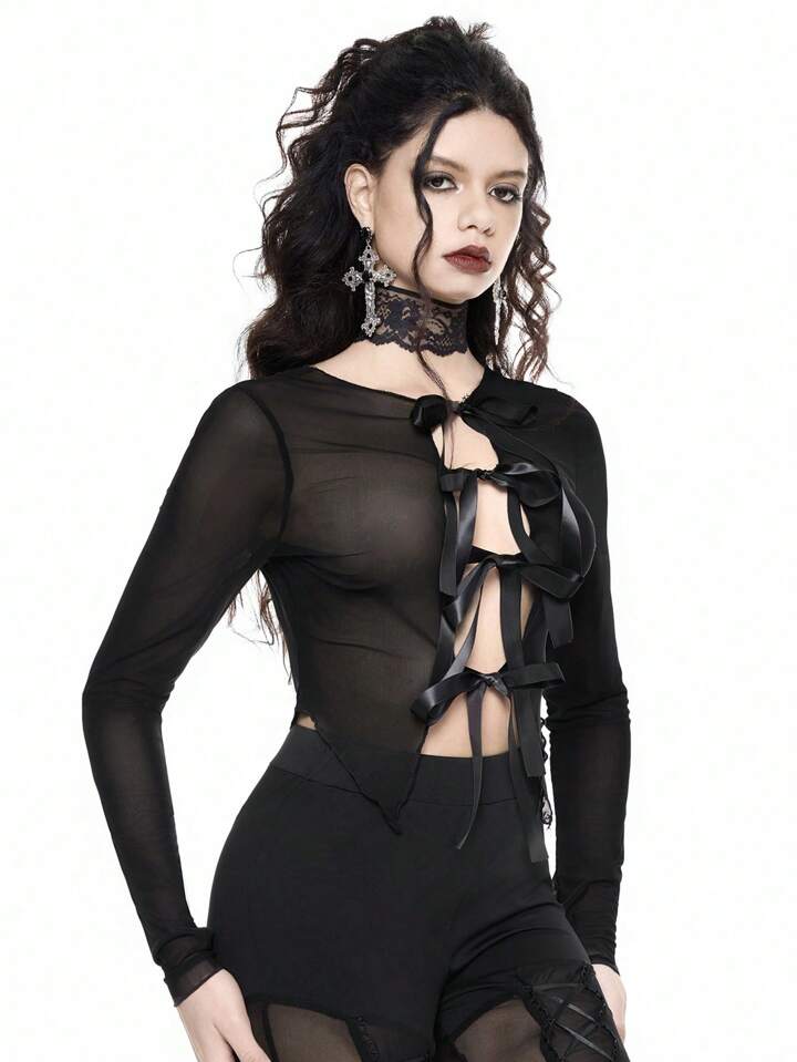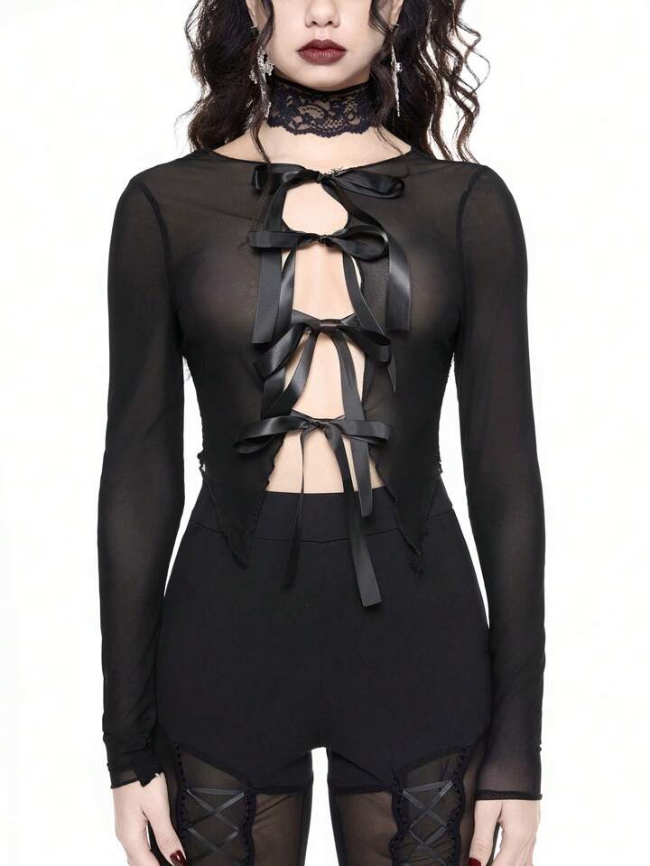 Goth Women's Black See-Through Mesh Strap Hollow Bowknot Sexy Crop Top, Suitable For Valentine's Day, Party, Music Festival
