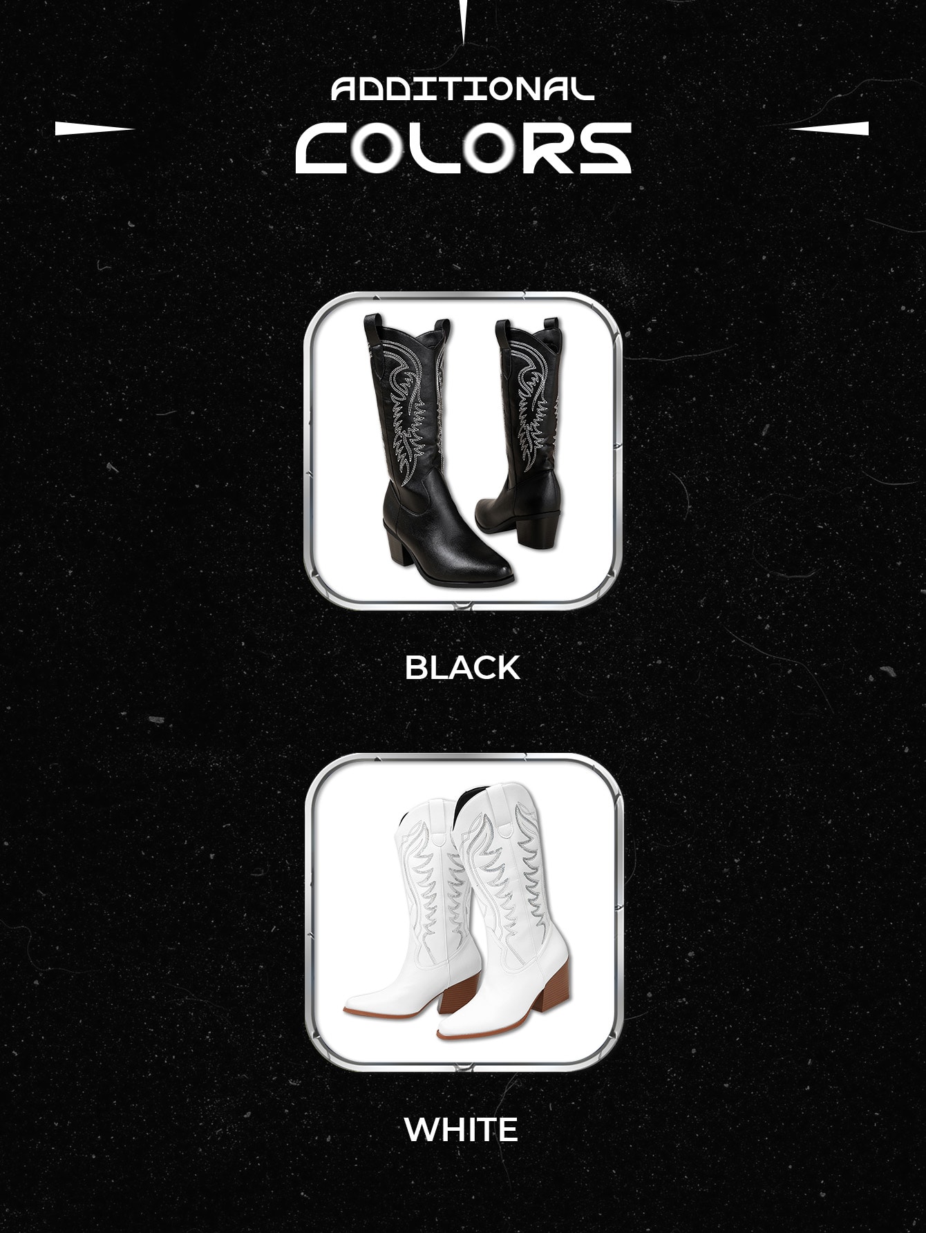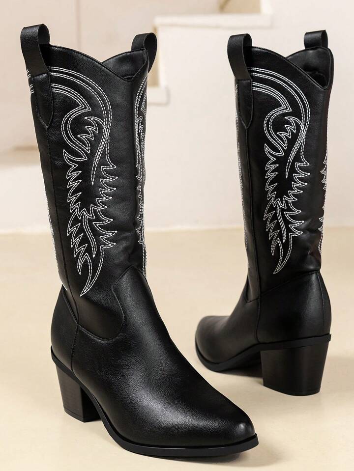 Goth Women's Black Western Cowboy Boots With Embroidery, Pointy Toe & Chunky Heel, New Arrivals For Spring/Autumn Spring Shoes