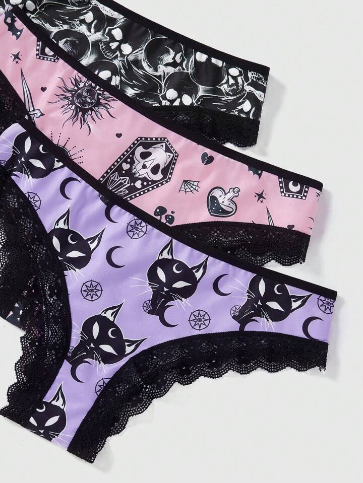 Goth Women's Cartoon Print Patchwork Lace Triangle Panties