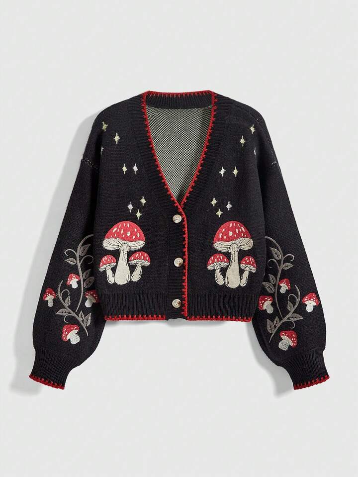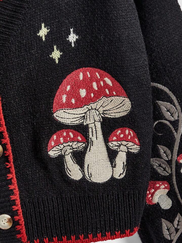 Goth Women's Casual Mushroom Plant Embroidery Cardigan, Autumn/Winter