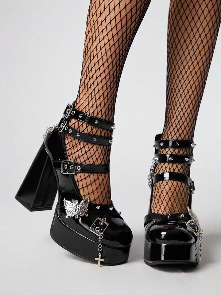 Goth Women's Fashionable Stilettos Strap Mary Jane Patent Leather Black Punk Style Pumps