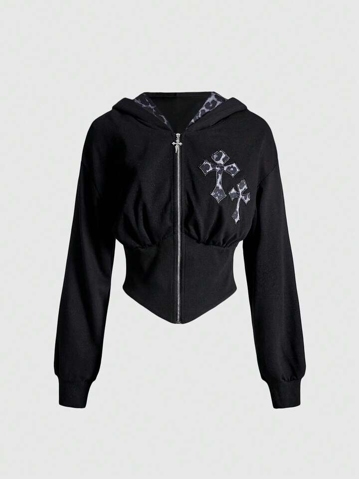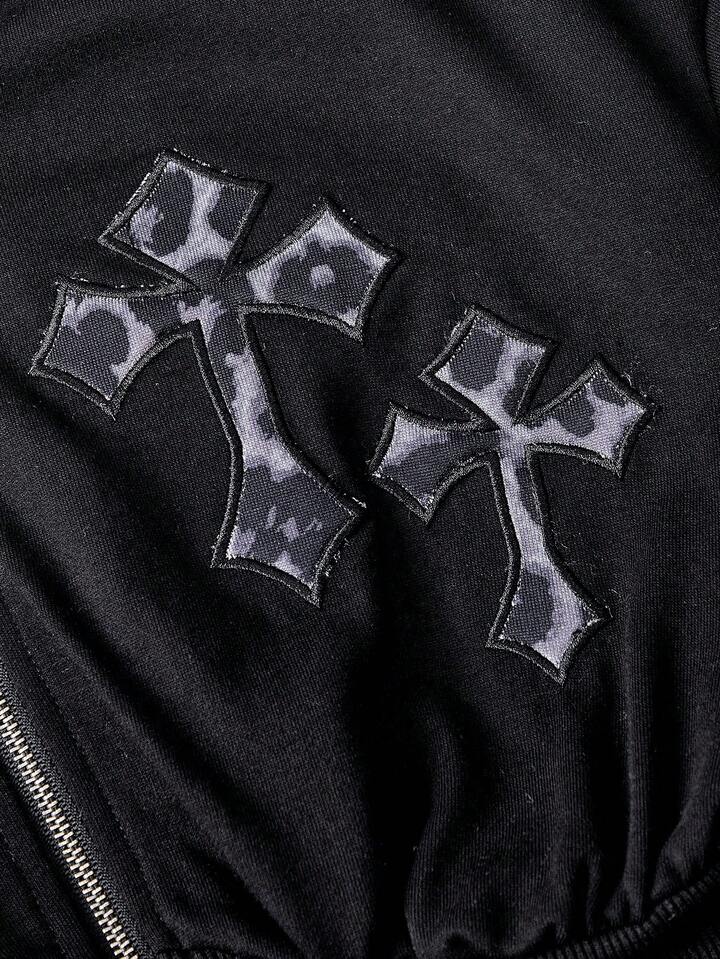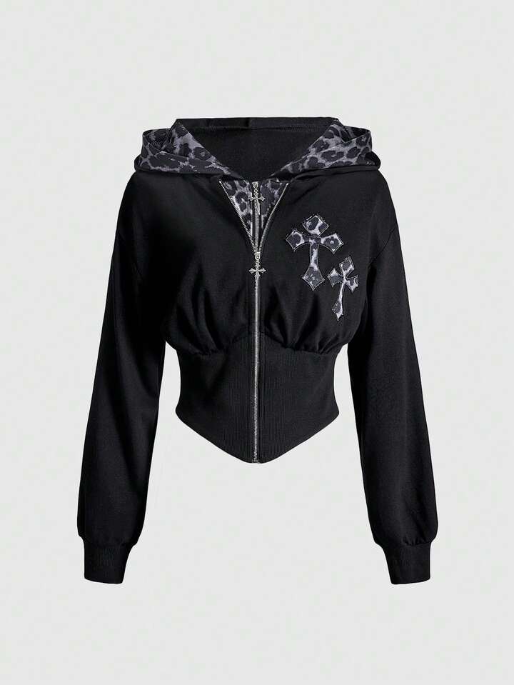 Goth Women's Kpop Retro Y2K Fitted 2 In 1 Leopard Print Cross Embroidered Hoodie Sweatshirt
