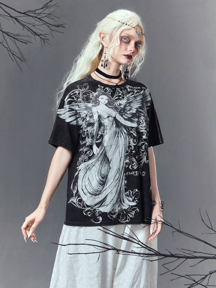 Goth Women's Portrait & Letter Print Round Neck T-shirt