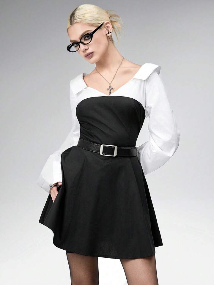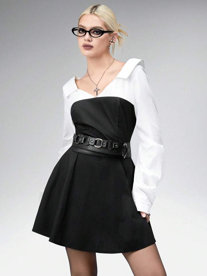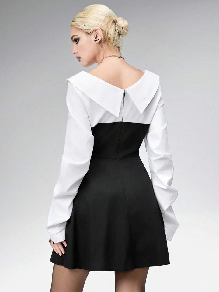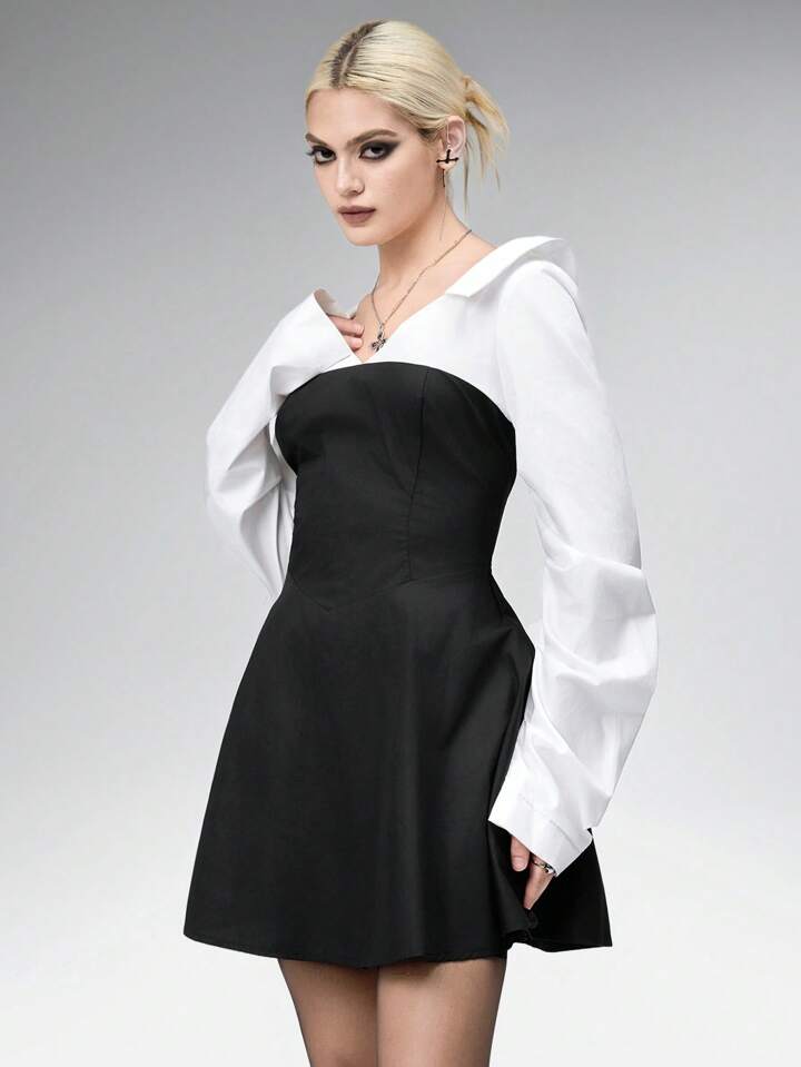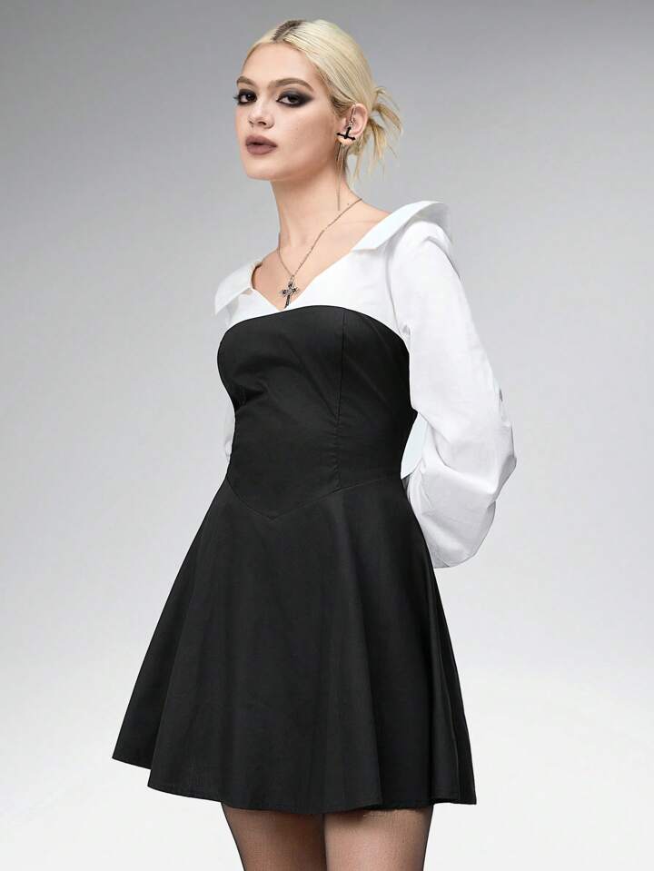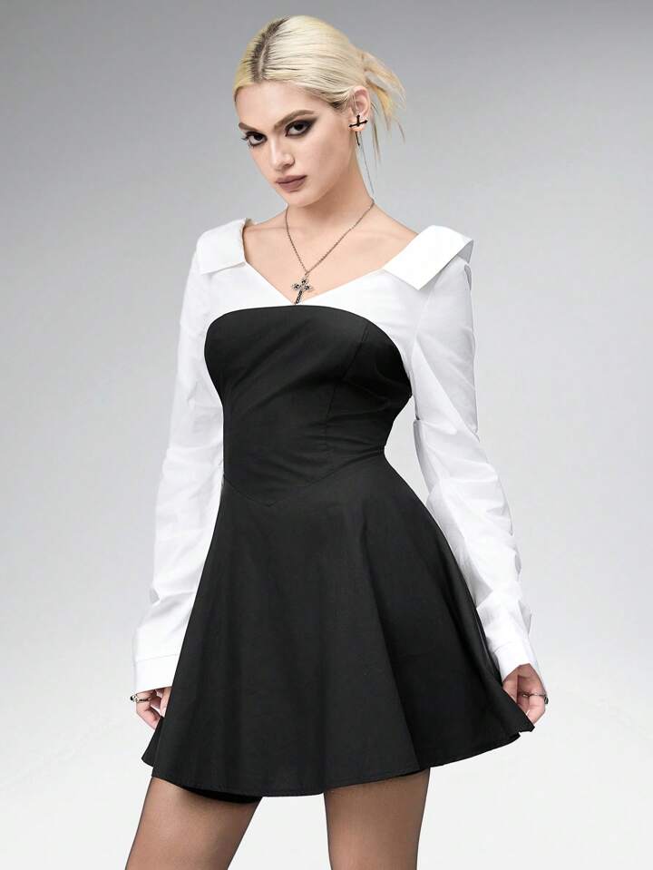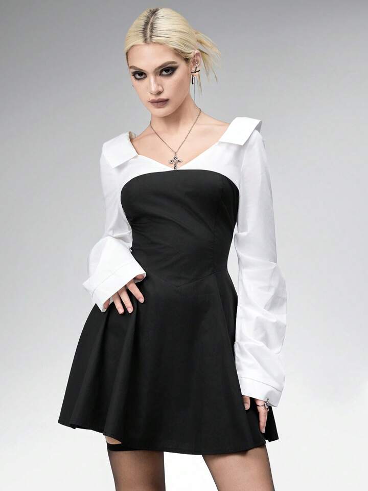 Goth Women's Sexy Deep V-Neck Patchwork Shirt Dress