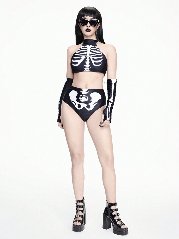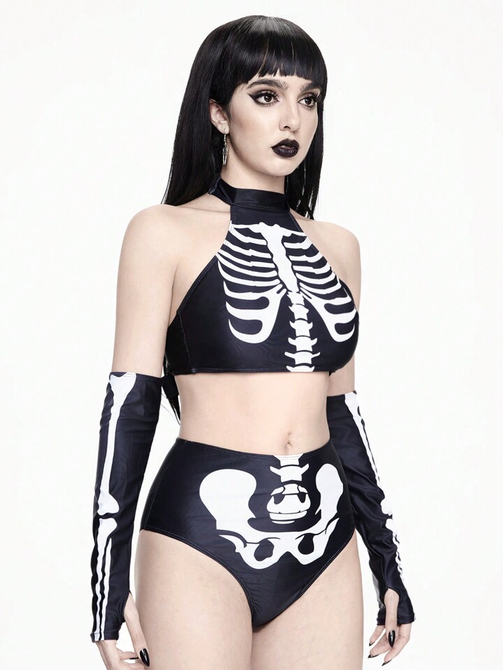 Goth Women's Skeleton Printed Halter Neck Sexy Bikini Set