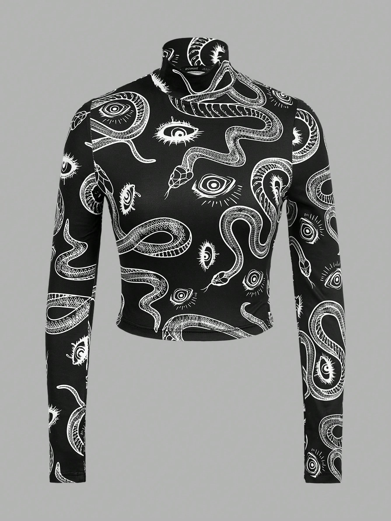 Goth Women's Snakeskin Print Turtleneck Full Printed Stretchy Tight T-shirt