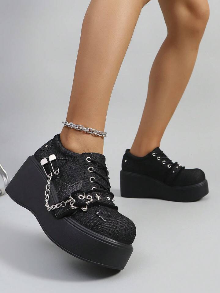 Goth Women's Spring/Autumn Thick Black Sneakers With Metal Buckle, Casual And Versatile Wedge Sports Shoes Fall
