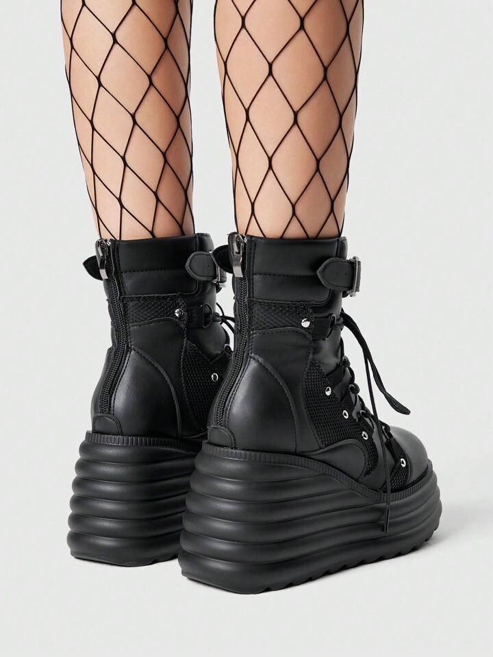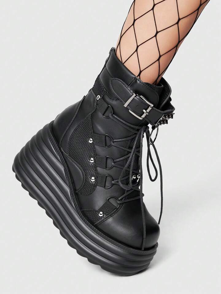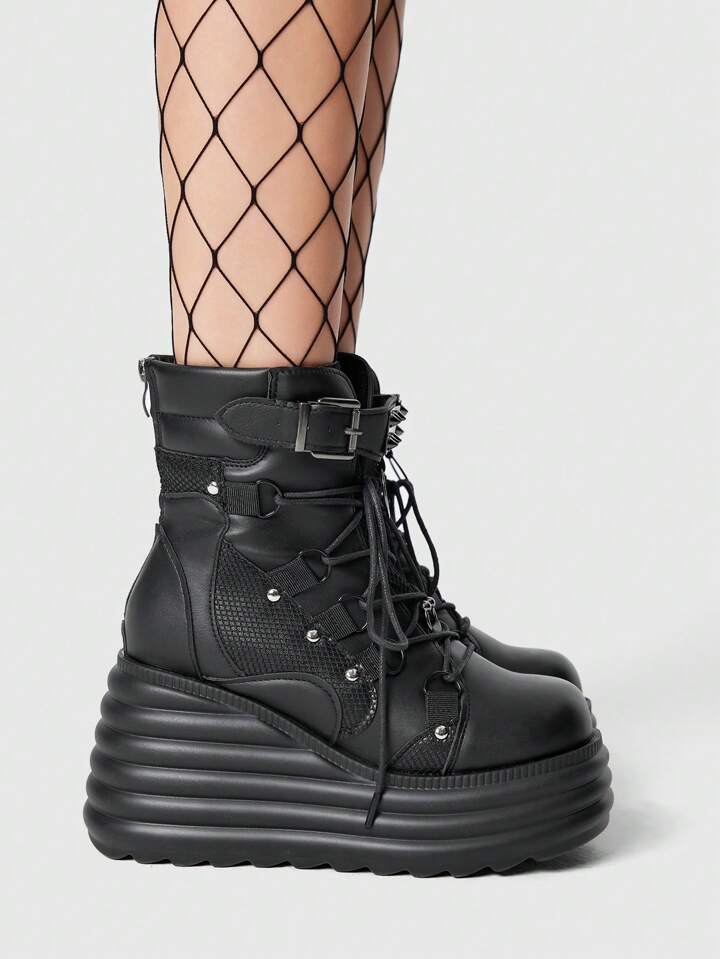 Goth Women's Studded Mesh Contrast Round Toe Chunky Heel Dark Punk PU Ankle Boots, Black, For Casual, Rock, Street, Campus Wear