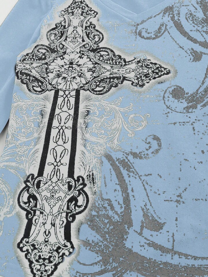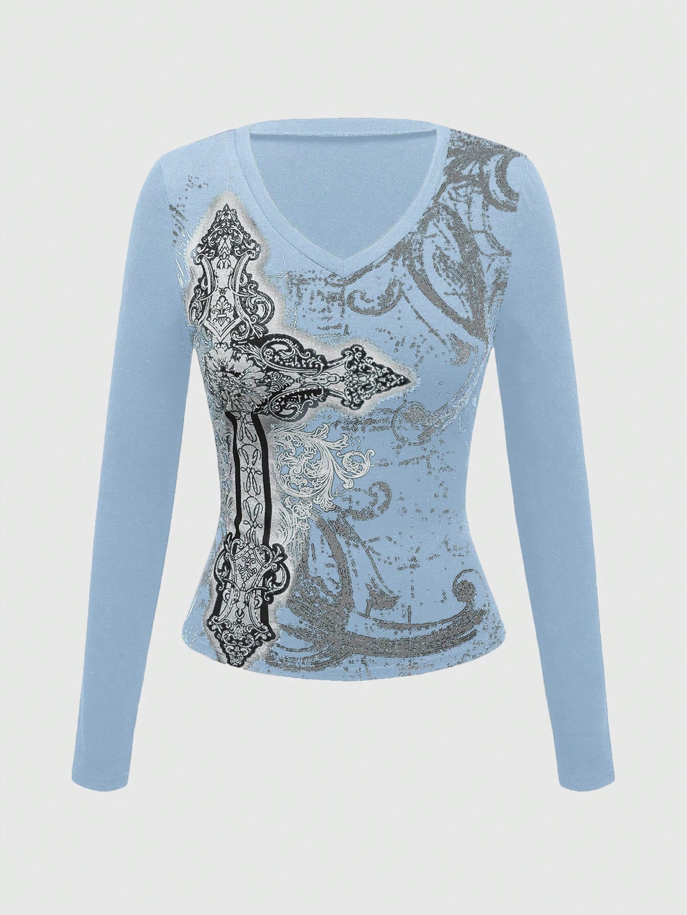 Goth Women's V-Neck Cross Print Fitted Elegant Long Sleeve T-Shirt