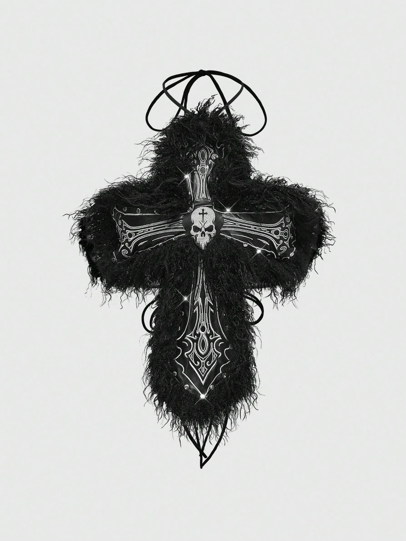 Women's Vintage Gothic Cross & Skull Embroidery Metal Rivet Sexy Backless Furry Patchwork Blouse