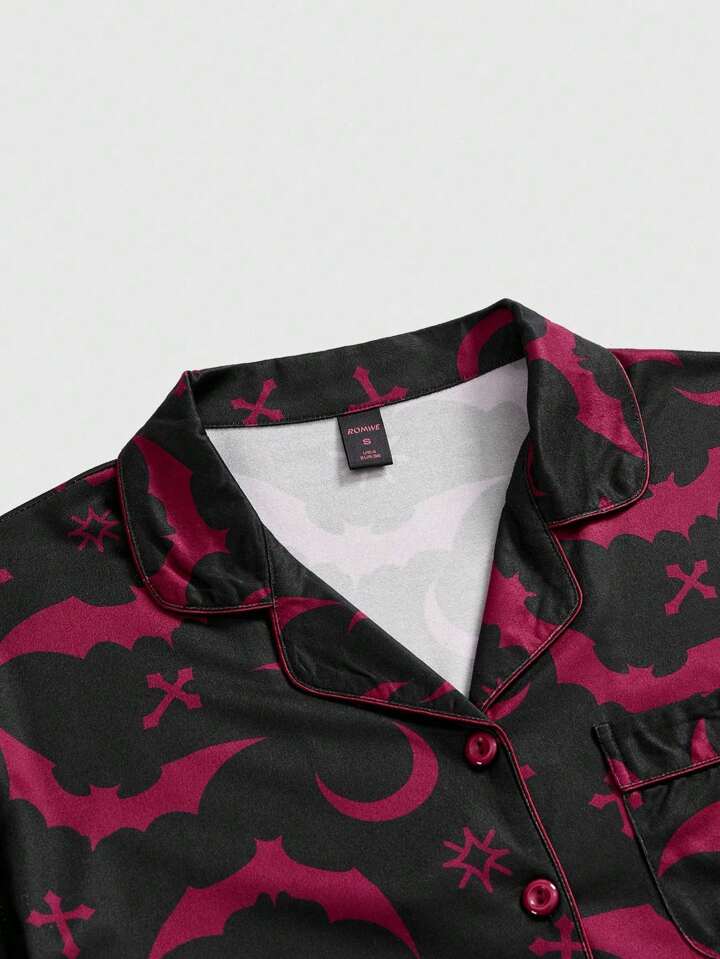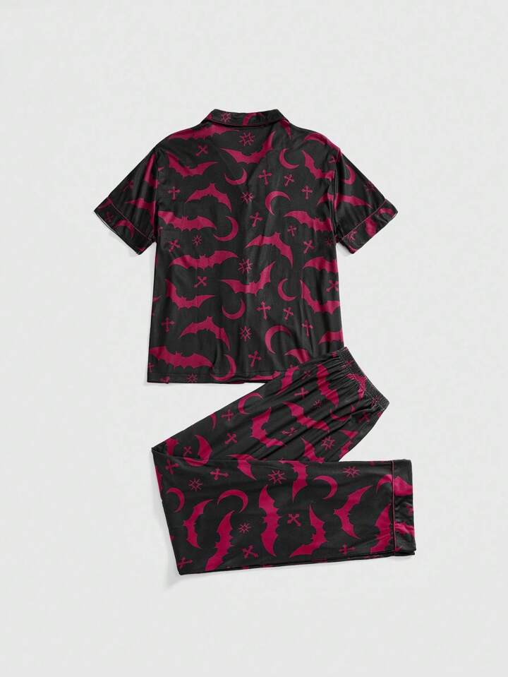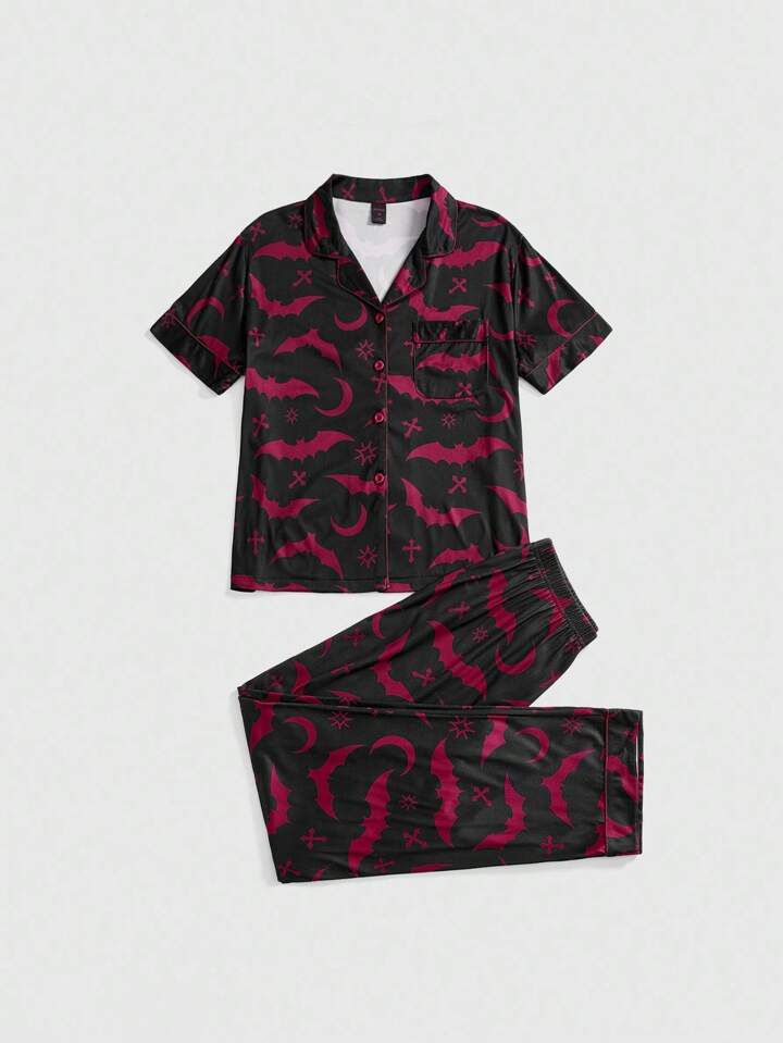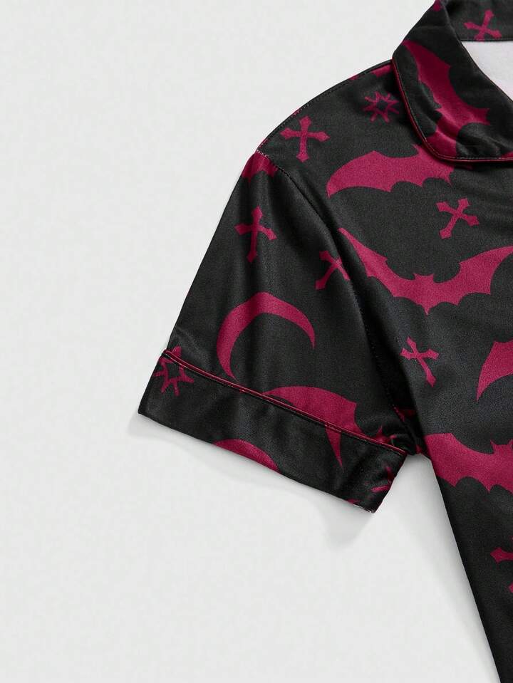 Gothic Bat & Cross Print Shirt Cardigan & Pants Casual Pajama Set, Halloween
