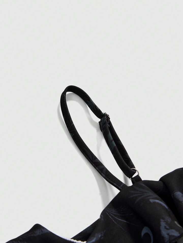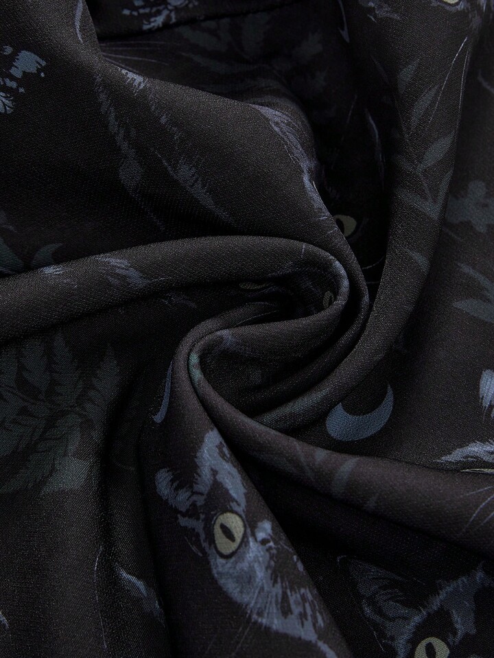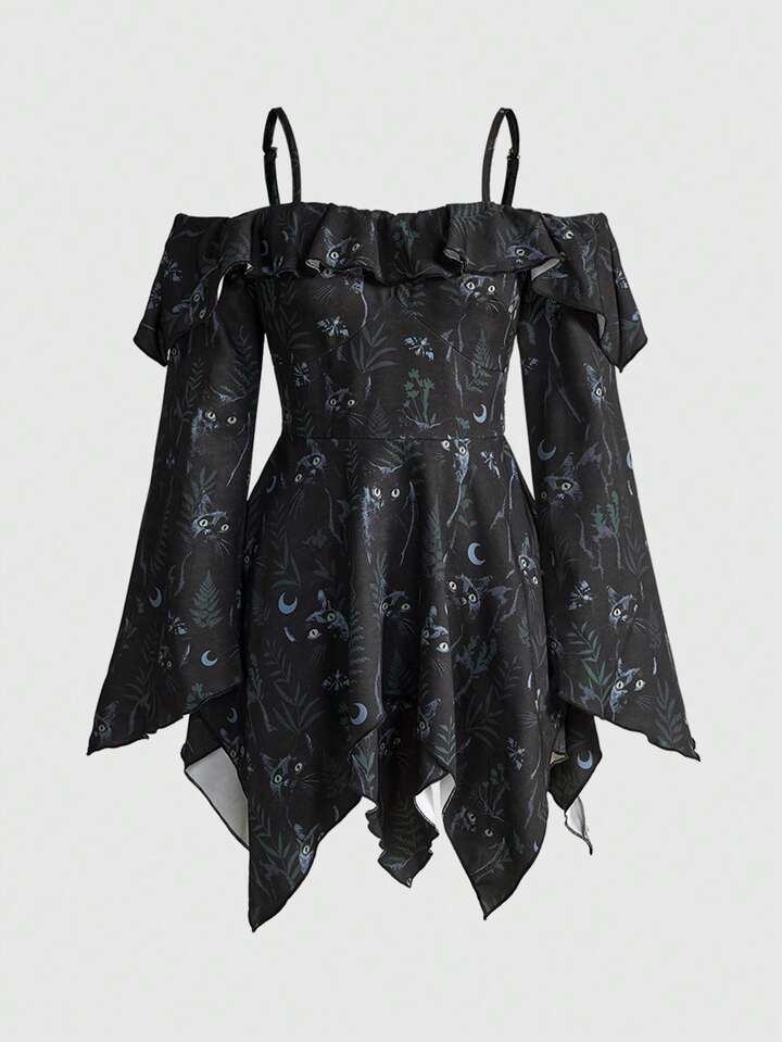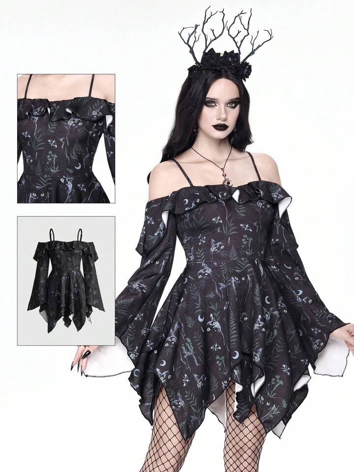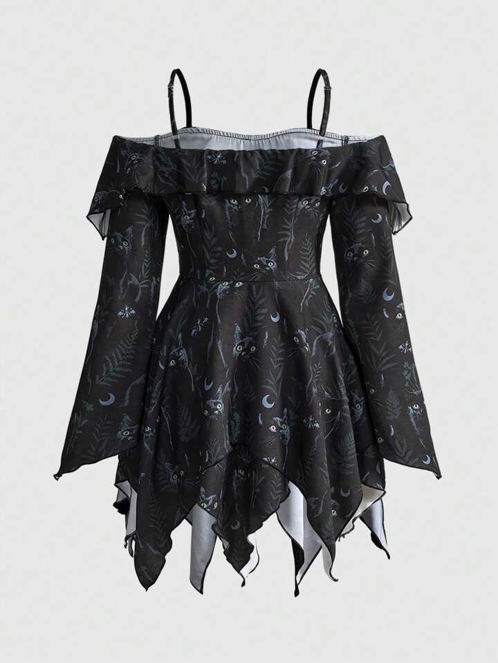 Gothic Cat & Plant Print Off Shoulder Fitted Asymmetrical Hem Dress