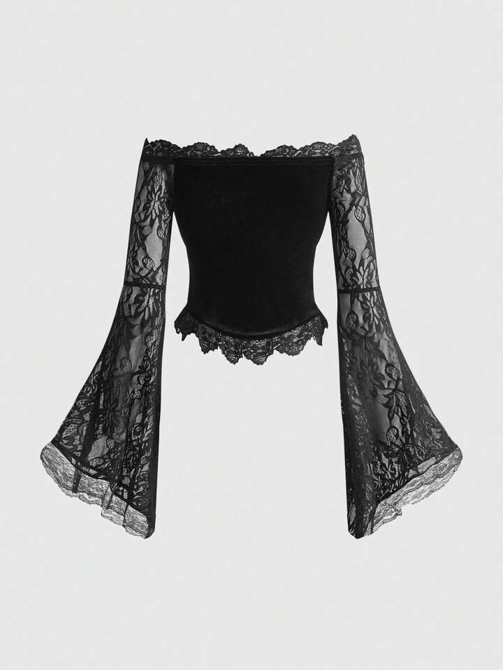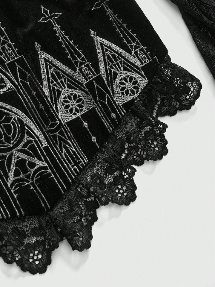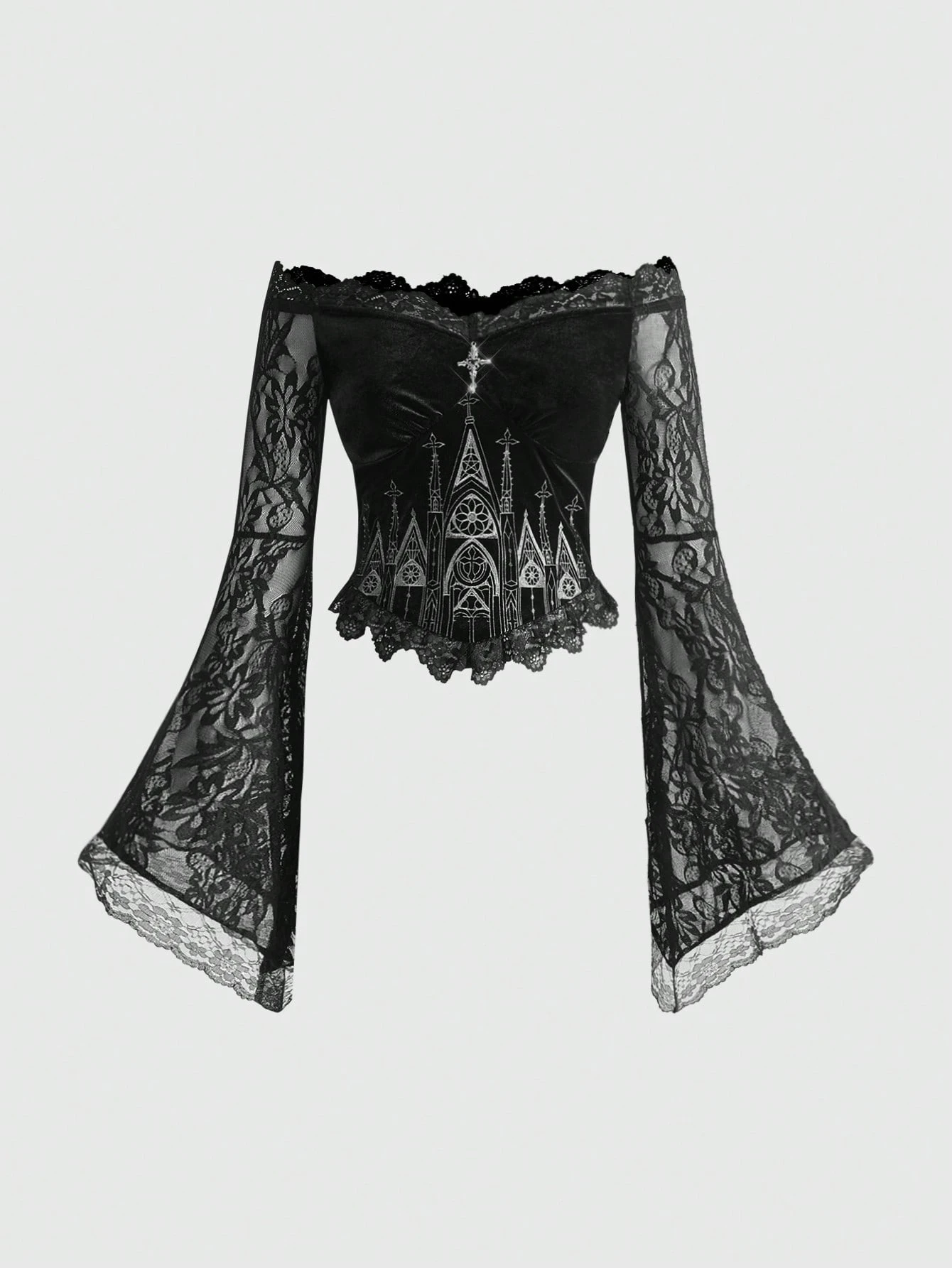 Gothic Church Embroidery Off-Shoulder Lace Bell Sleeve Velvet Fitted Blouse For Women