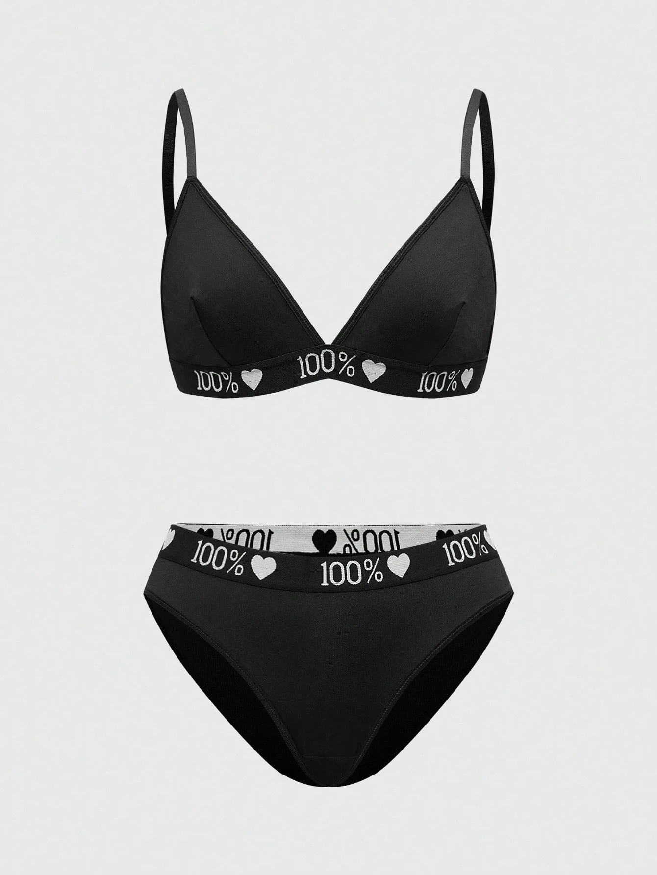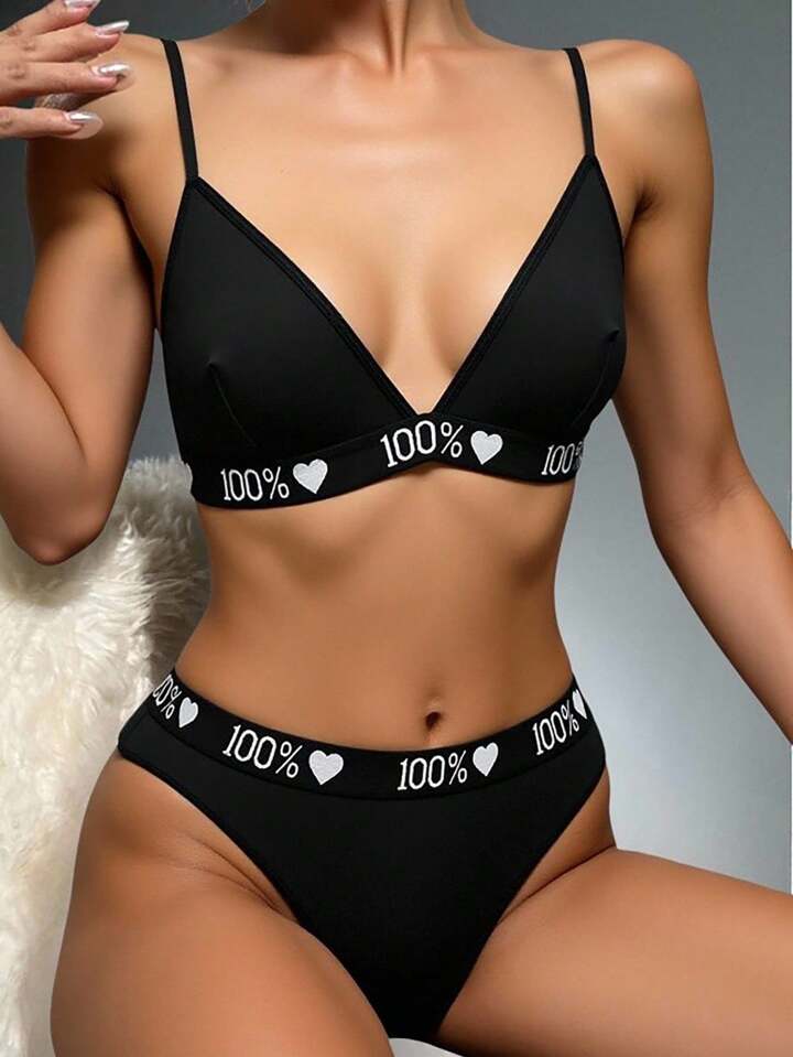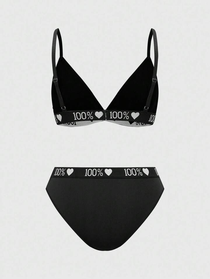 Gothic Dark Heart Elastic Webbing Triangle Cup Bra & Panties Lingerie Set