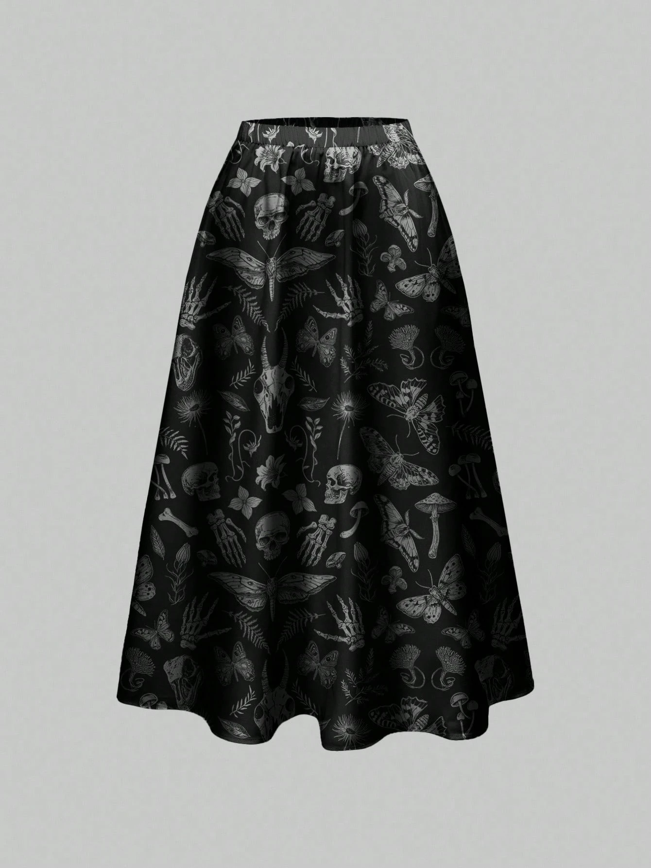 Gothic Dark Horror Halloween Crow Skull Moth Plant Print Black Full-Print Women Skirt