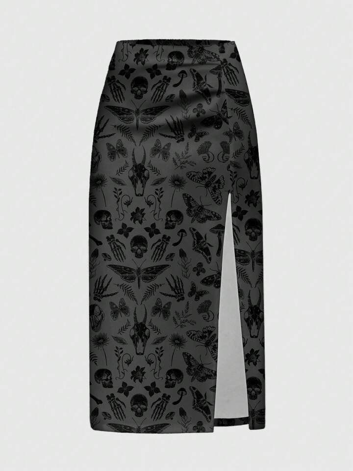 Gothic Dark Mysterious Skull, Butterfly & Leaf Print High Slit Sexy Women Skirt
