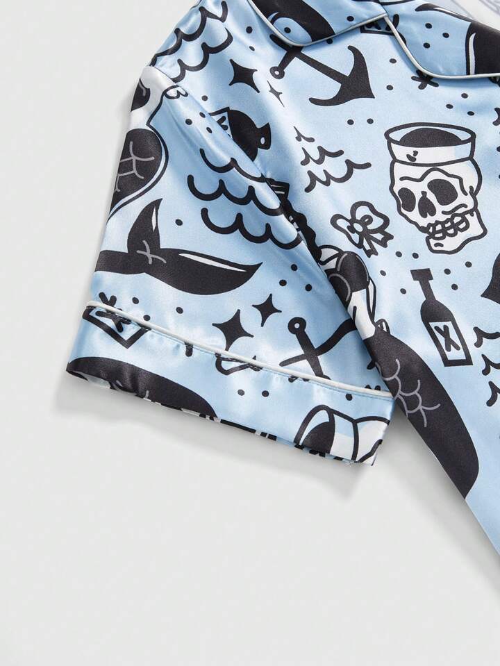 Gothic Dark Summer Mermaid Skull & Star Wave Print Shirt Style Cardigan & Shorts Satin Pajama Set