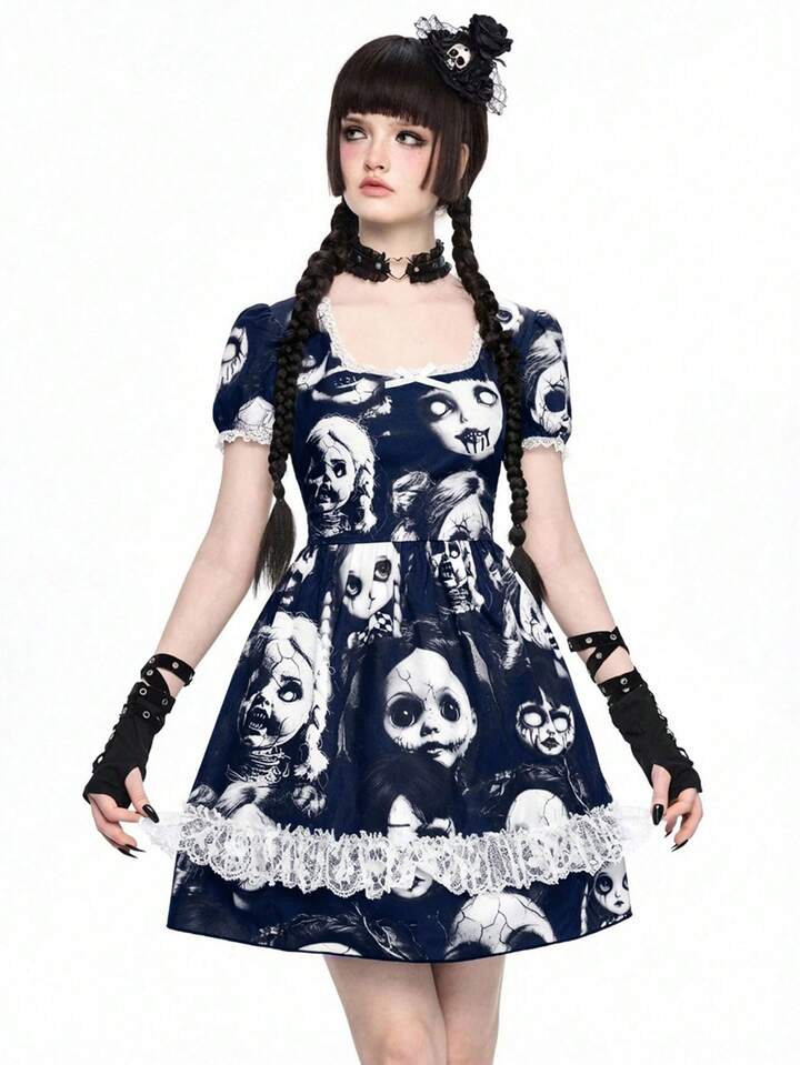 Gothic Dark Witch Lace Patchwork Doll Print Short Dress For Women