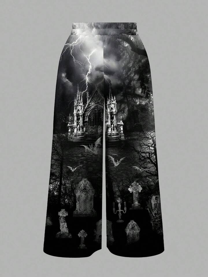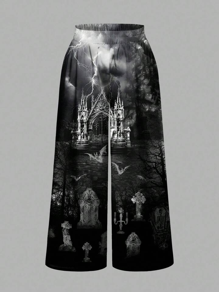 Gothic Dark Witch Mysterious Grave Cross Raven Plus Size Loose Wide Leg Pants, All-Over Print, Halloween