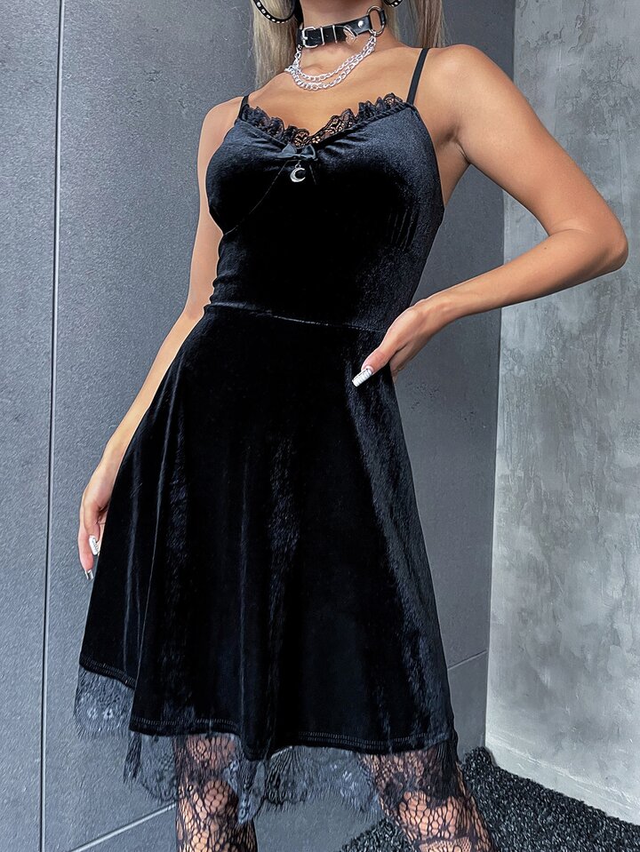 Gothic Lace Scallop Hem Bow Front Velvet Cami Dress