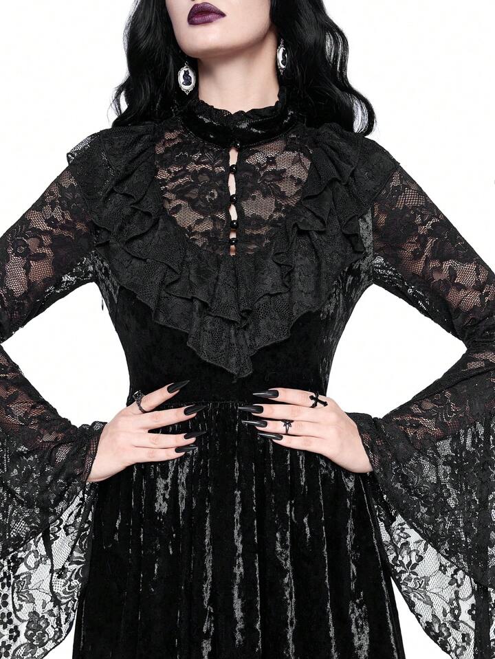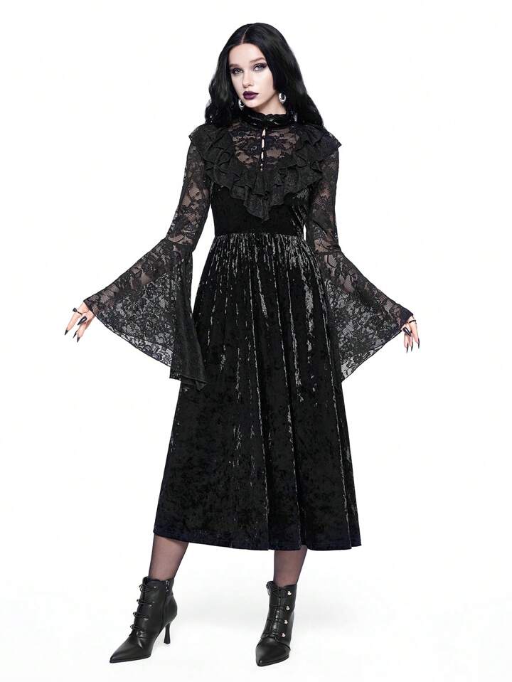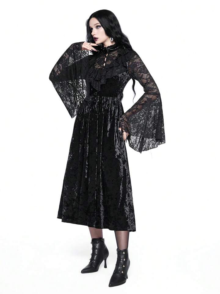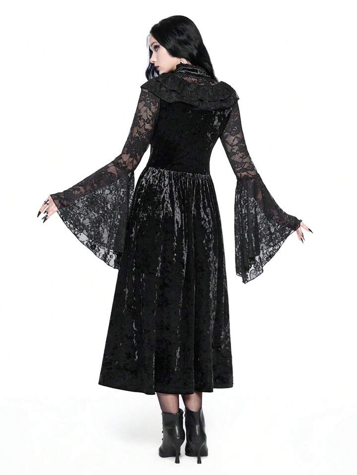 Gothic Regal Style Contrast Lace Flare Sleeve Velvet Long Dress For Party, Halloween Ball Gowns, For New Year