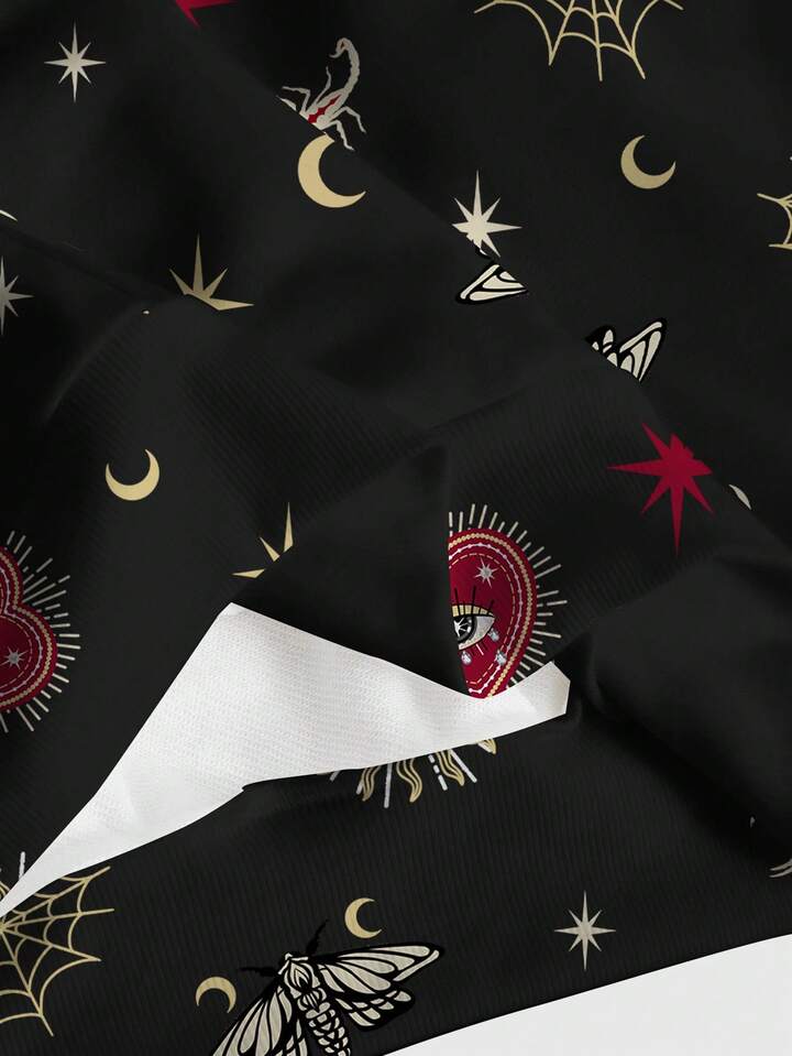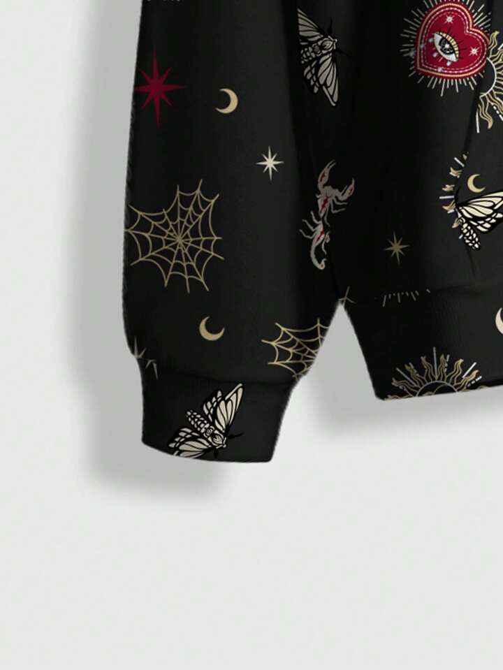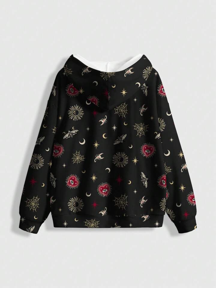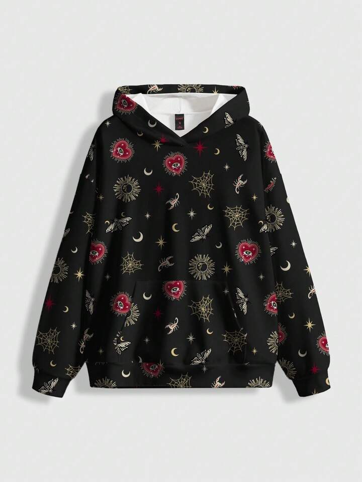 Gothic Retro Palace Style Heart, Cross, Sun, Moon & Star Gemstone All-Over Print Loose Fit Hoodie Sweatshirt For Women