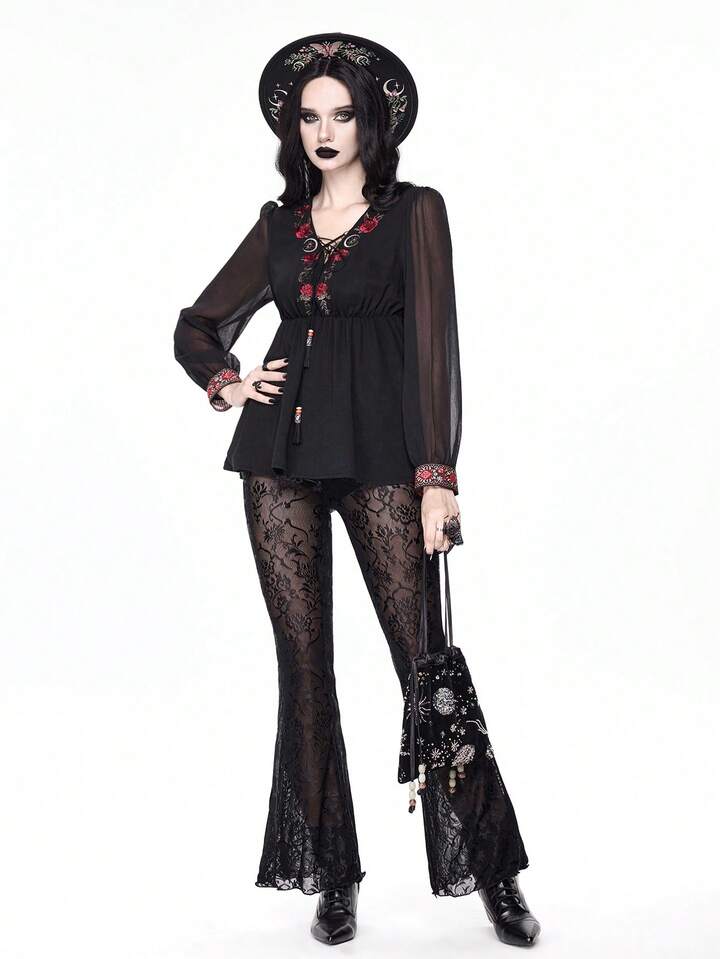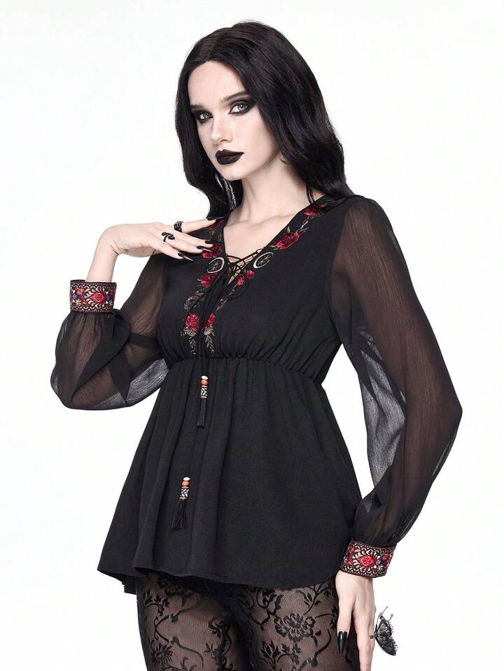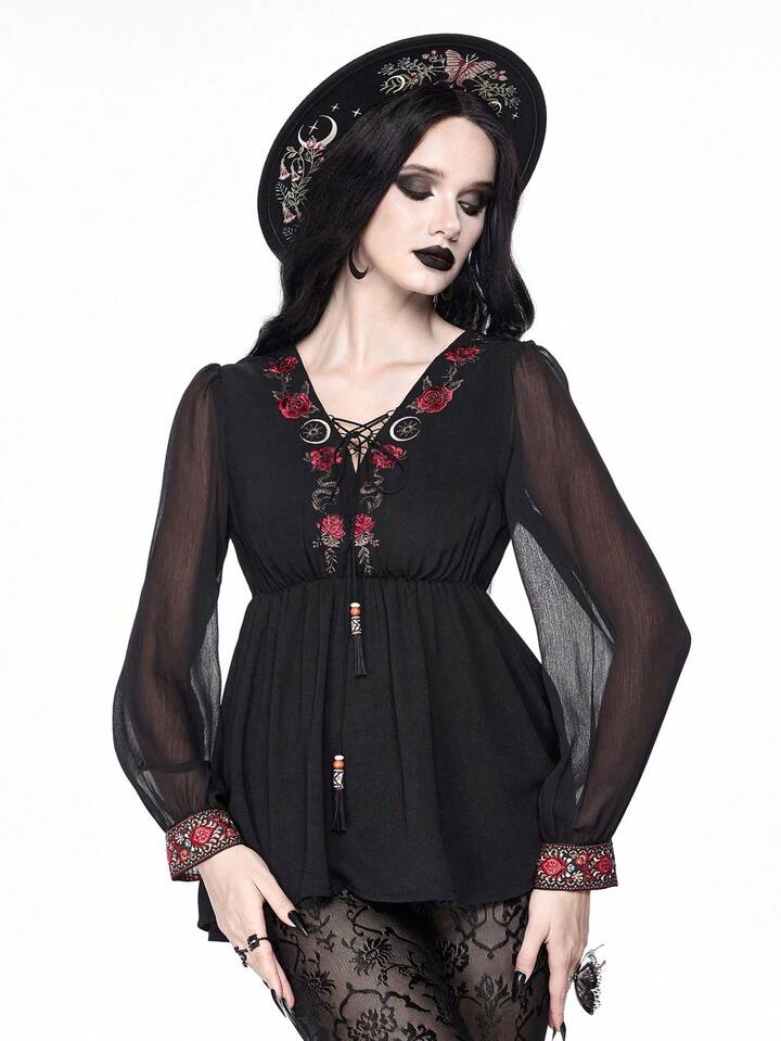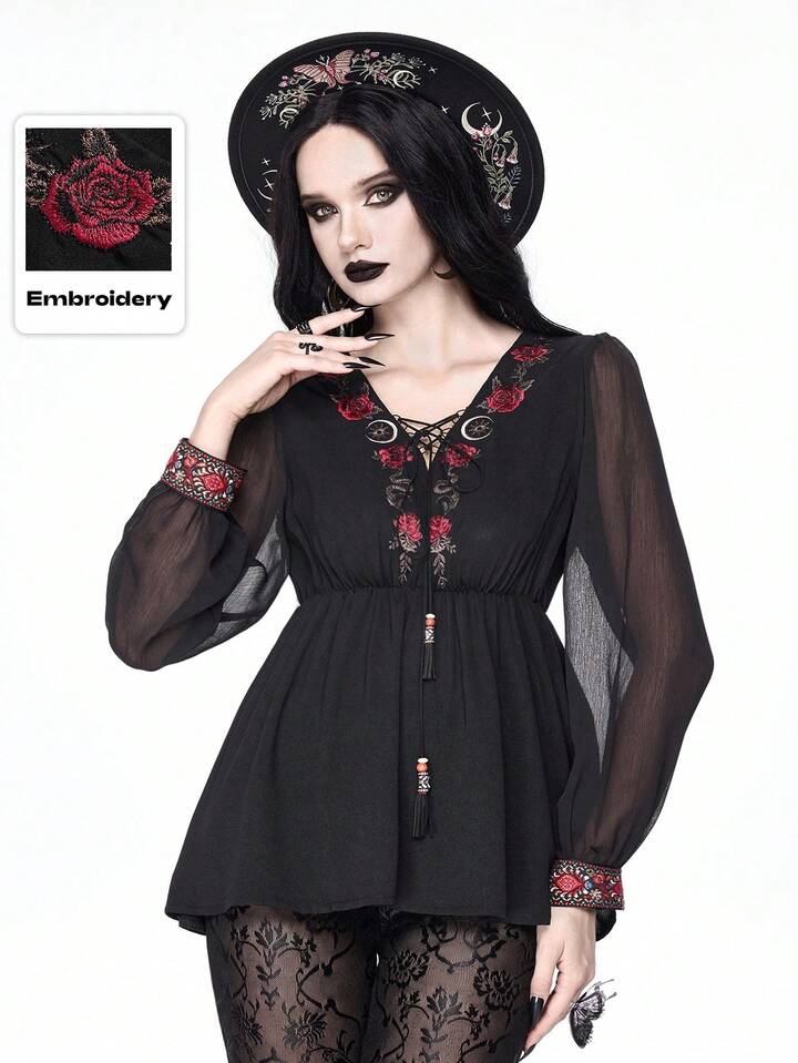 Gothic Retro Rose Snake Skin Star Moon Embroidery Pattern A-Line Deep V-Neck Tie-Up Black Chiffon Puff Sleeve Fitted Women Top