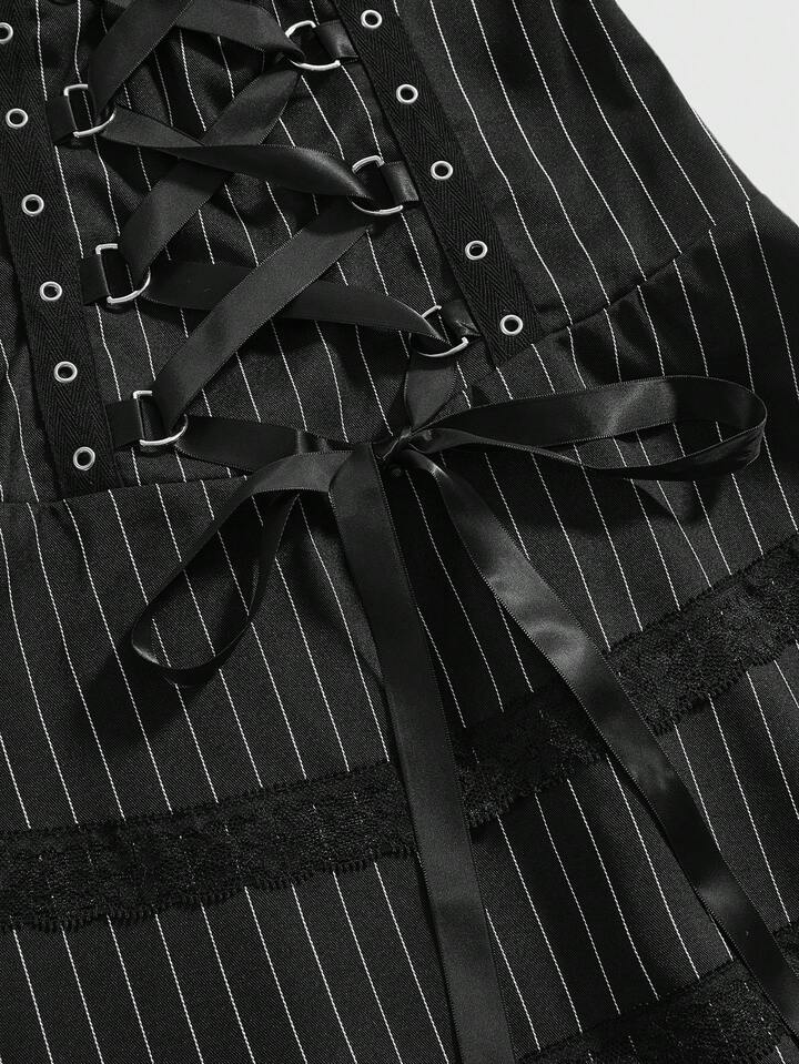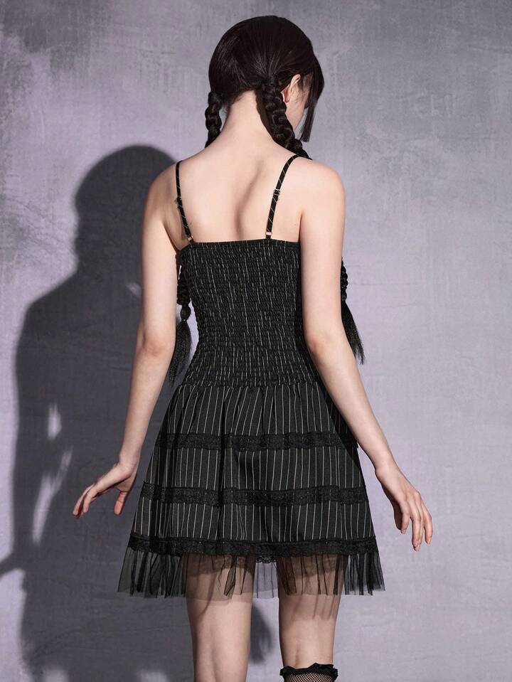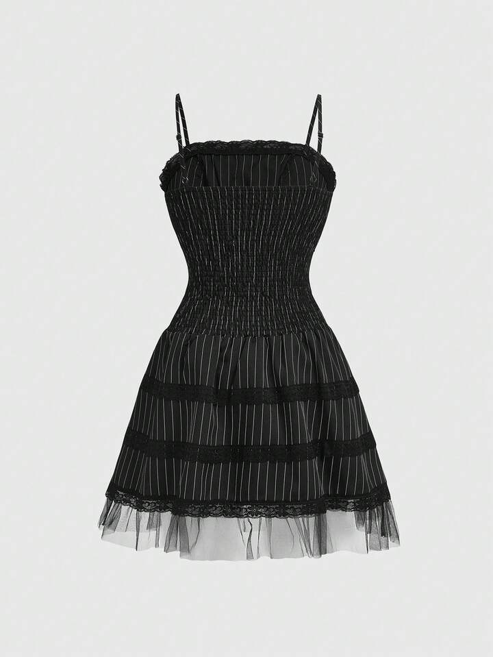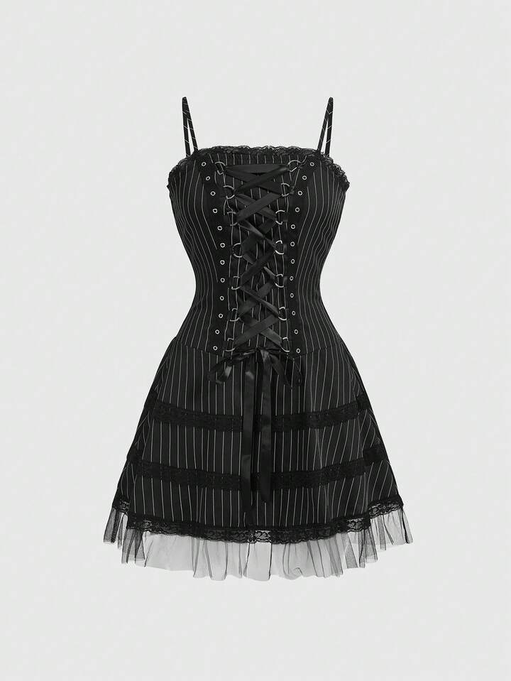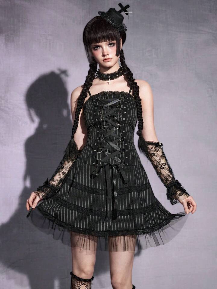 Gothic Romantic Lace Trim Tie-Up Design Mesh Splice Thin Striped Slip Dress For Women