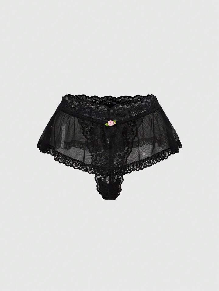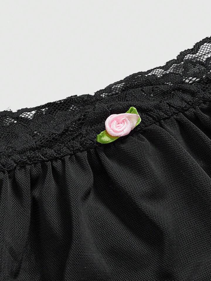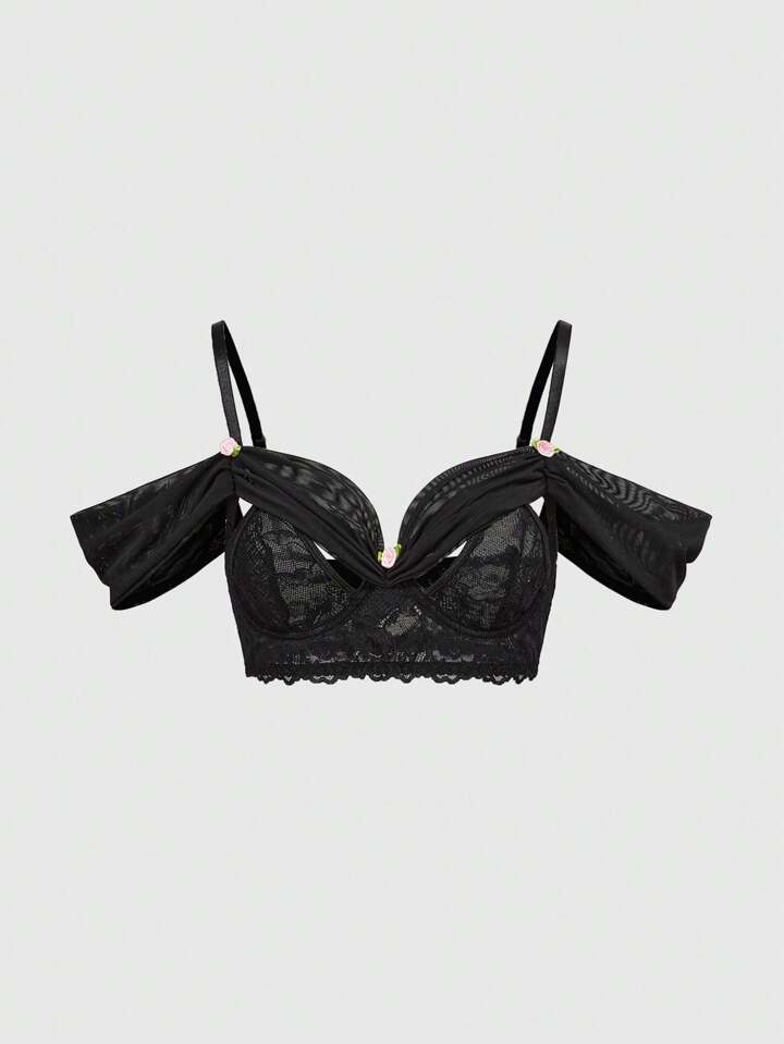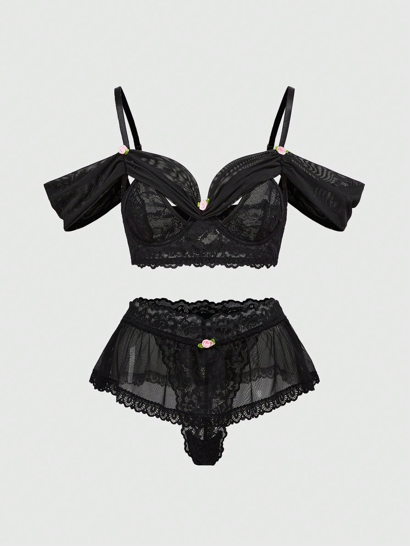 Gothic Rose Lace & Mesh Bow Decor Padded Bra & Panties Sexy Lingerie Set, Sweet For Valentine's Day