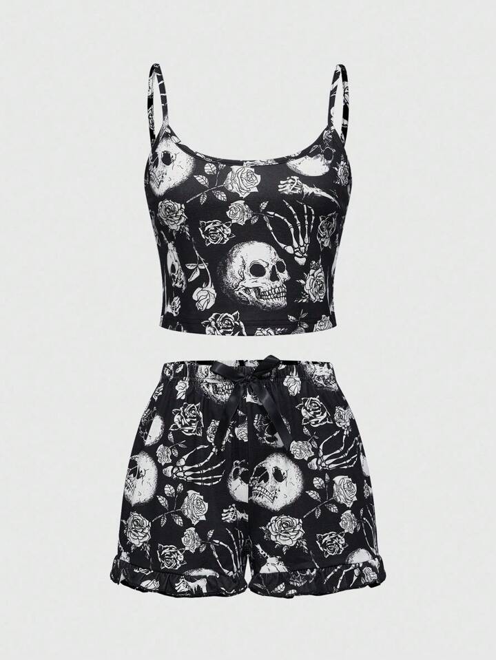 Gothic Skull & Rose Print Camisole & Shorts Pajama Set, Casual Sleepwear, Halloween