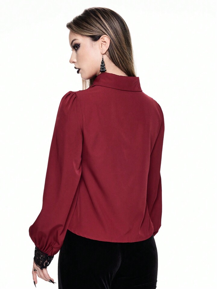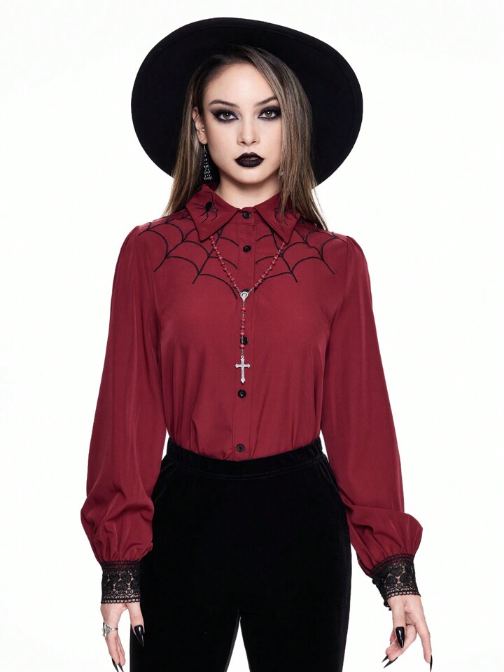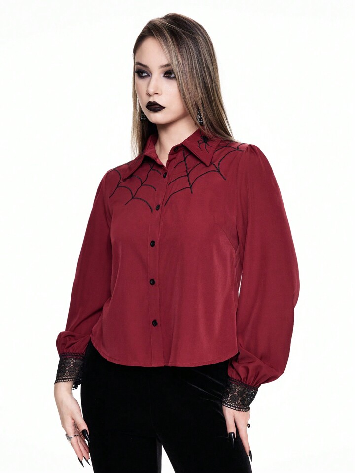 Gothic Spider Web Embroidered Burgundy Women Blouse, Can Be Worn As Inner Layer
