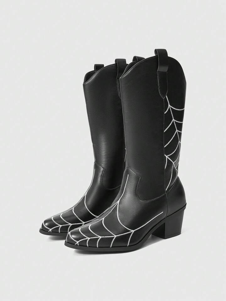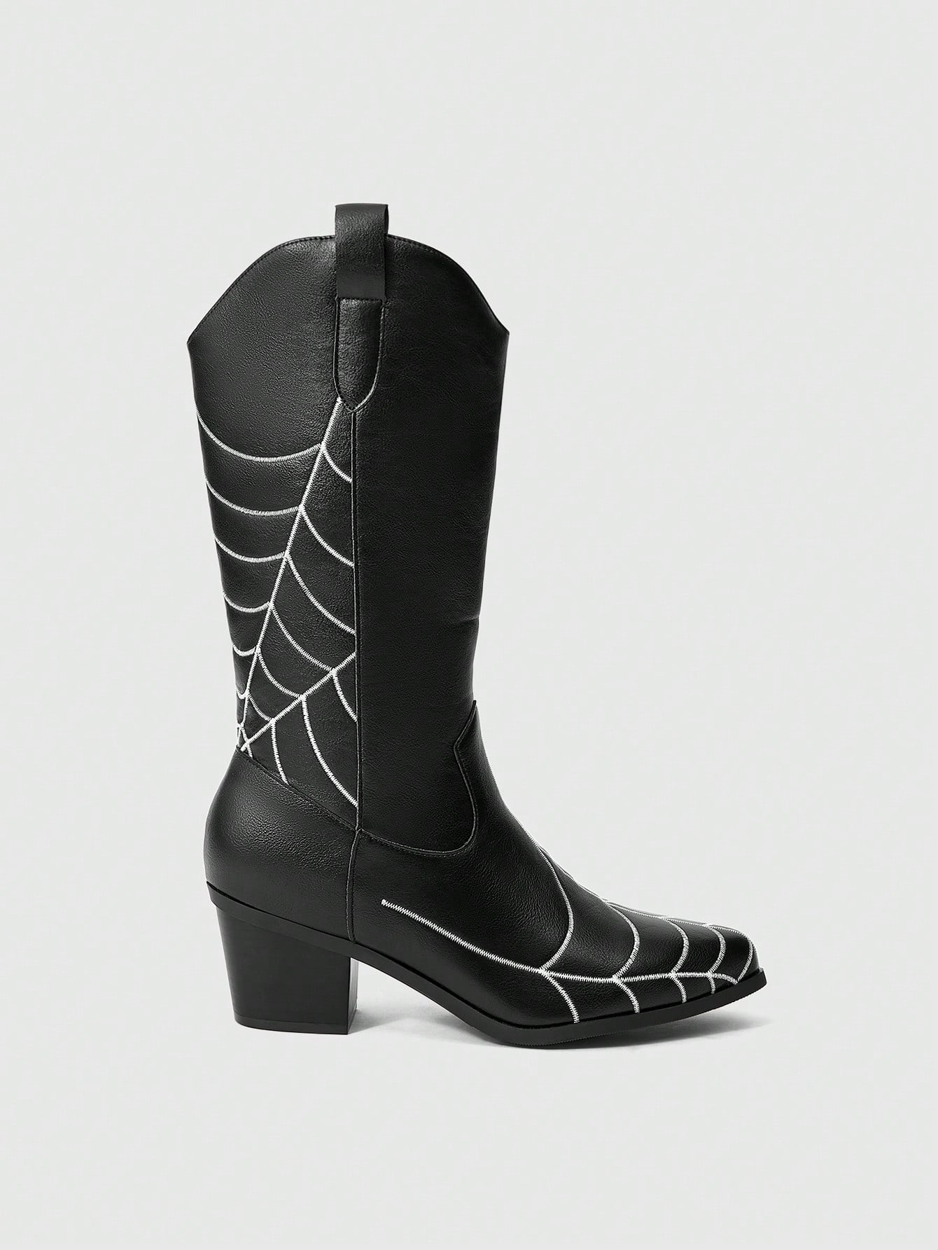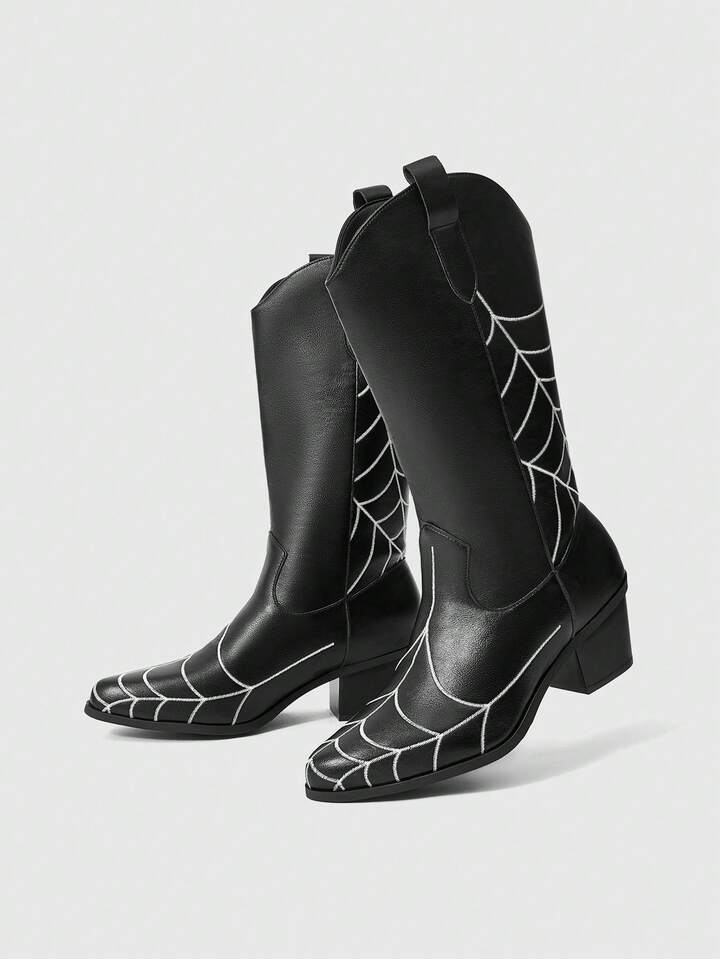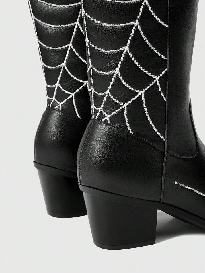 Gothic Spider Web Embroidery Pointed Toe Chunky Heel Mid-Calf Boots, Dark Punk Style For Daily Wear, Campus And Street, Halloween