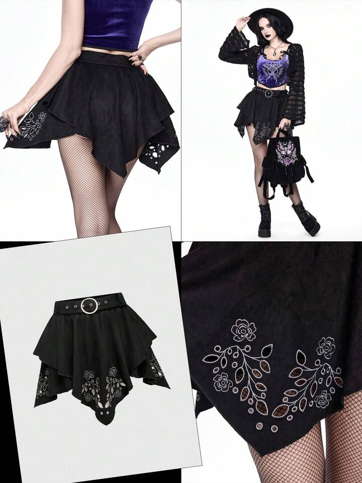 Gothic Style Floral Burnout Embroidery Pattern Asymmetric Hem Suede-Like Fabric Women Skirt