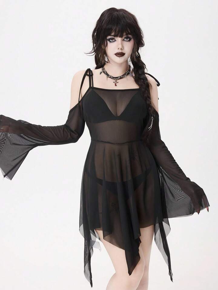 Gothic Style Mesh Flared Sleeve Asymmetric Hem Dress Smock, Halloween