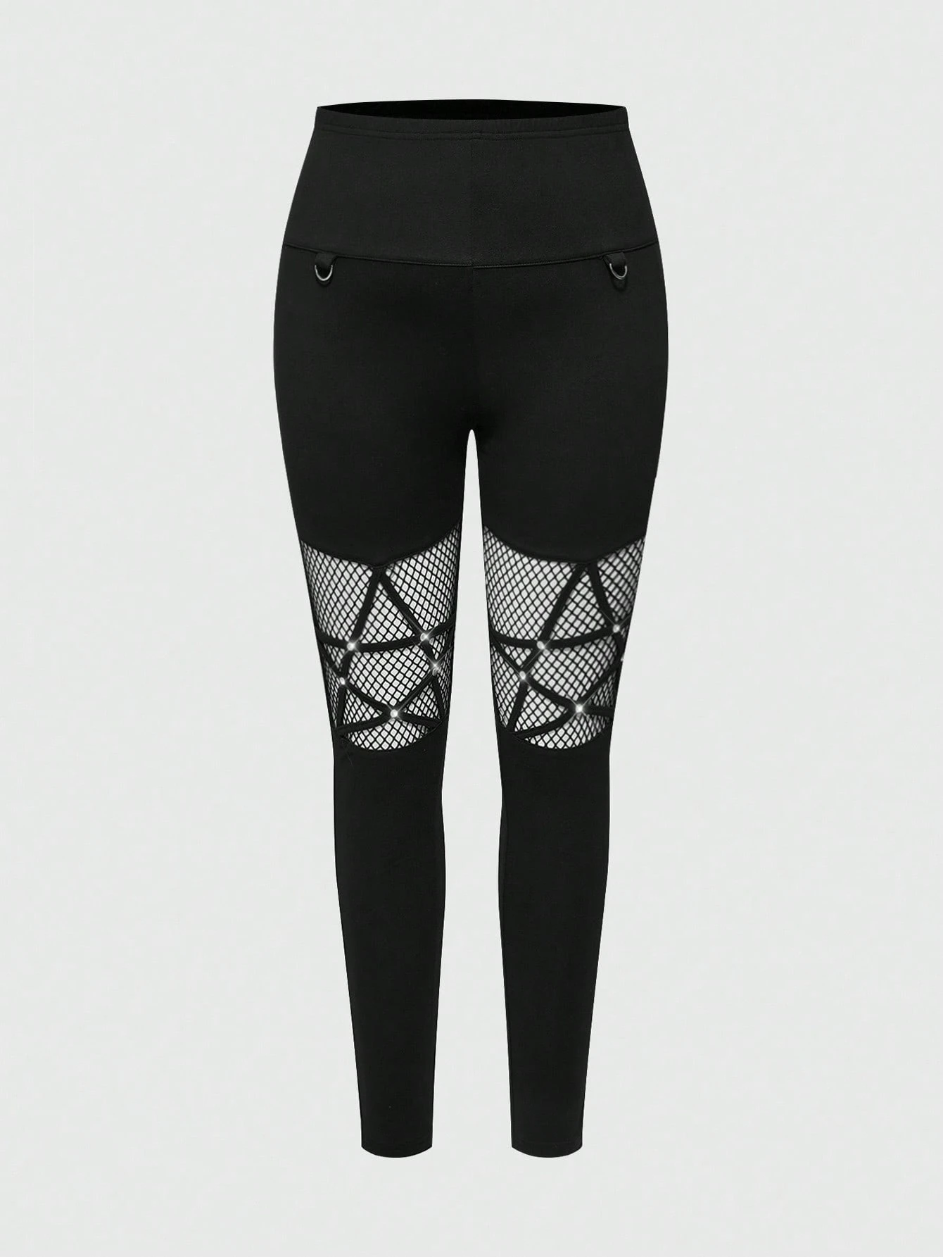 Gothic Style Pentagram Studded Mesh Patchwork Women's Skinny Stretch Pants