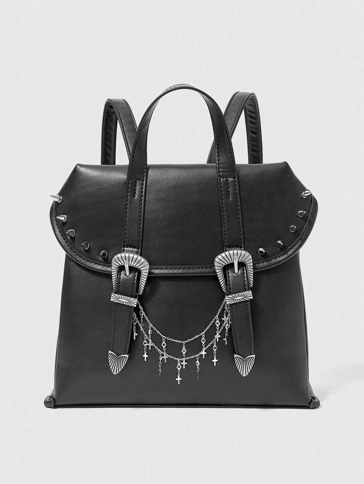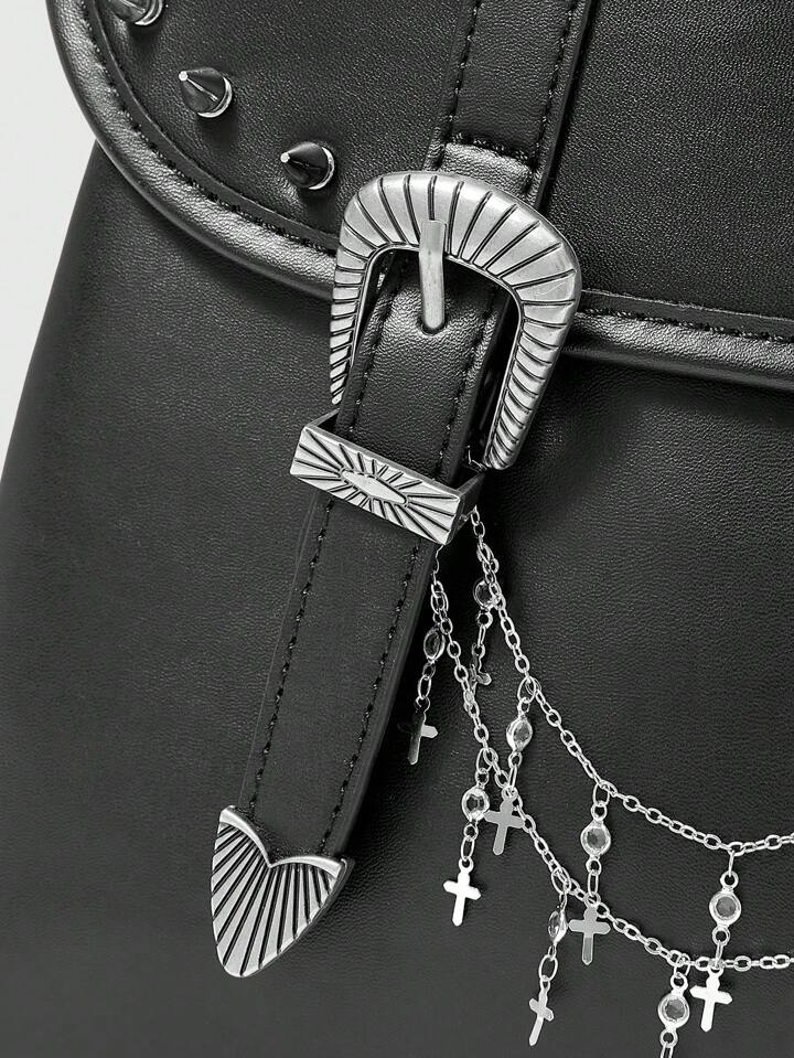 Gothic Vintage Backpack With Buckle & Cross Chain Detailing, Studded Accents For Edgy School Season Style - Dark Aesthetic Everyday Bookbag Back To School